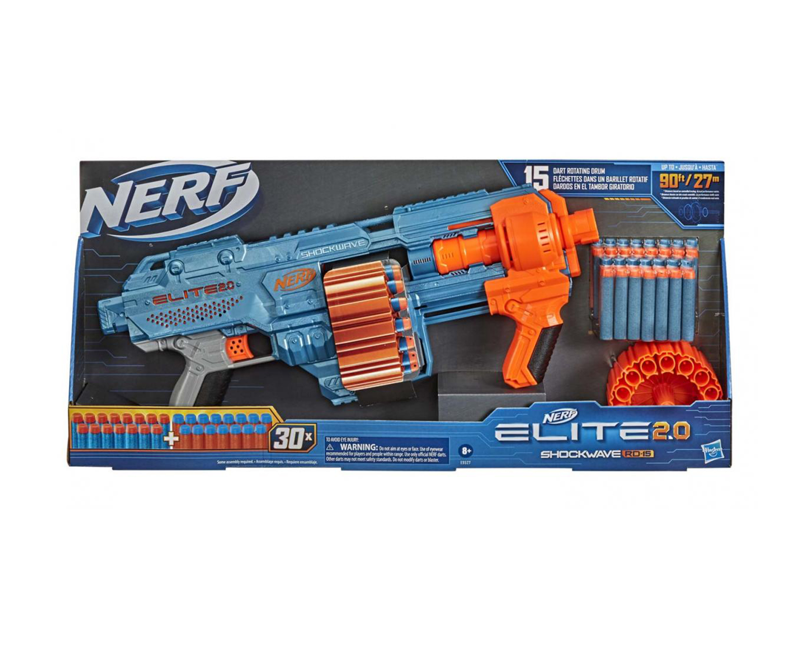 Elite 2.0 Shockwave RD-15 ist ein Blaster von Nerf Gun, der Pump-Action und ein 15-Dart rotierendes Trommelmagazin für erhöhte Kapazität und Effizienz bietet. Er ist für alle konzipiert, die eine taktische und flexible Lösung für Nerf-Kämpfe suchen und beinhaltet Erweiterungsoptionen für Anpassungen. Shockwave RD-15 verfügt über drei Tactical Rail-Schienen, die die Montage zusätzlicher Zubehörteile ermöglichen, einen Befestigungspunkt für Laufverlängerungen und einen Schulterstützen-Befestigungspunkt.Die Konstruktion des Blasters ist robust und auf Benutzerfreundlichkeit ausgelegt. Durch das Zurückziehen des Spannhebels kann ein Dart abgefeuert werden, und wenn der Abzug gedrückt gehalten wird, können alle 15 Pfeile kontinuierlich durch wiederholtes Bewegen des Spannhebels abgeschossen werden. Die Einheit feuert Darts bis zu 27 Meter weit ab, was dem Spieler in Kampfszenarien einen Vorteil verschafft. Shockwave RD-15 wird mit 30 offiziellen Nerf-Darts geliefert, wobei 15 für das integrierte Magazin und 15 als Reserve gedacht sind.