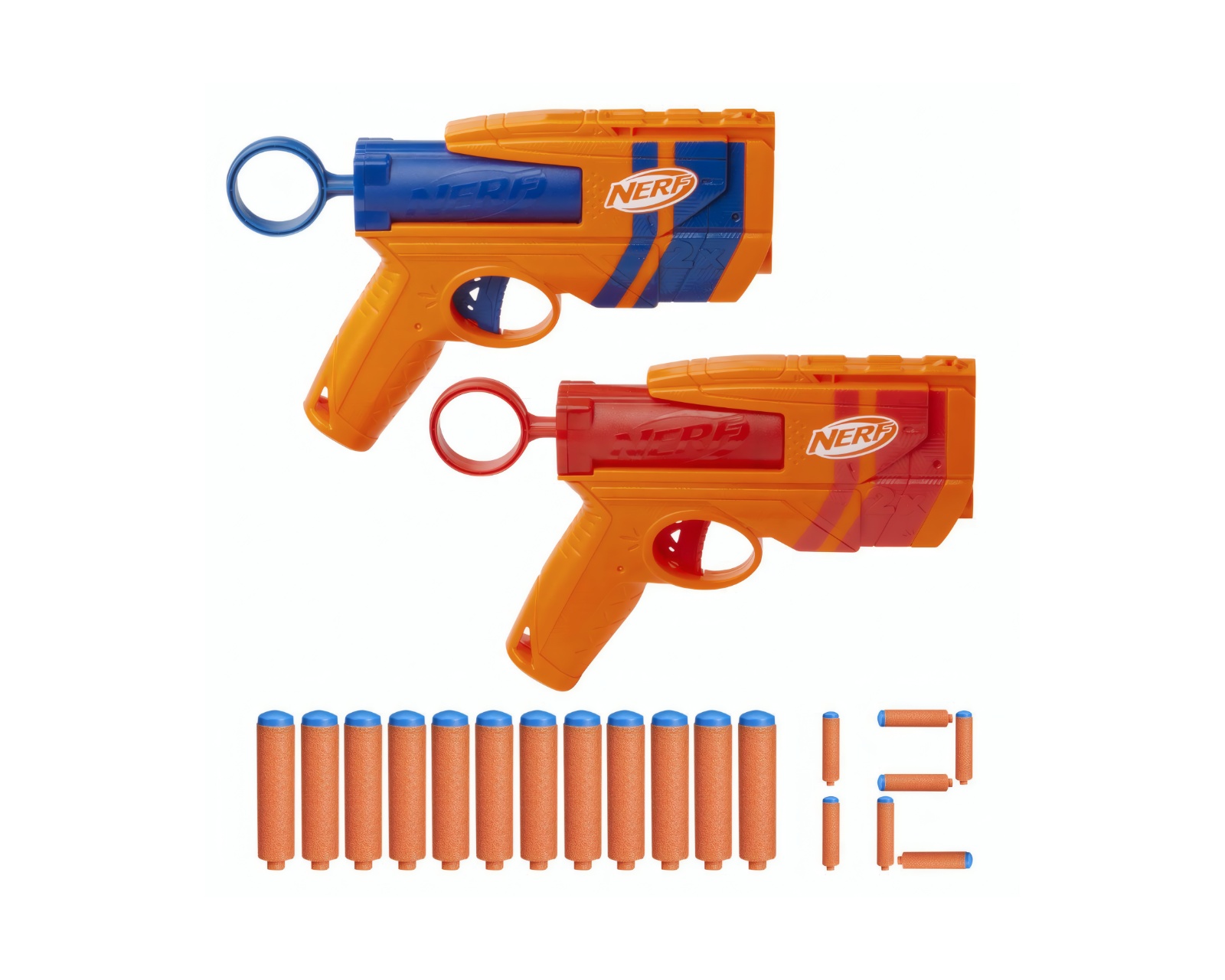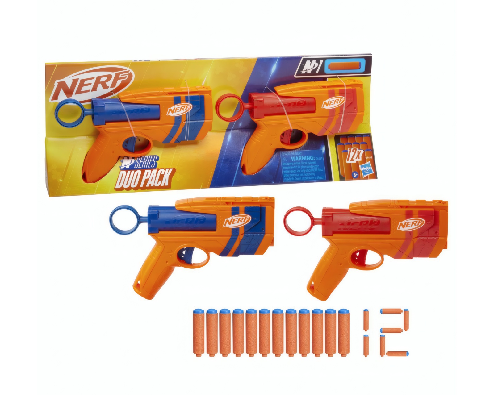 N-Series Duo Blaster ist ein Doppelpack von Dartblastern von Nerf, entworfen für sowohl Innen- als auch Außenanwendungen. Dieses Paket enthält zwei kompakte Blaster, jeder mit einer Kapazität von 2 Dartpfeilen und pull-back-Ladung. Mit 12 Nerf N1 Schaumstoffpfeilen, die enthalten sind, ist es optimal für eine schnelle und effiziente Nutzung im Spiel.Die Blaster sind mit Fokus auf Nachhaltigkeit und Leistung hergestellt und sind präzise in ihrem Design, um Reichweite und Genauigkeit zu maximieren. Sie sind speziell mit Nerf N1 Pfeilen kompatibel, was den Spielern ermöglicht, die Kapazität der mitgelieferten Munition effektiv zu nutzen. Jeder Blaster hat eine taktische Schiene, die die Integration verschiedener Zubehörteile ermöglicht, was die Kampfstrategie weiter anpassen kann. Sicherheitsbrillen werden empfohlen, sind jedoch nicht im Paket enthalten.