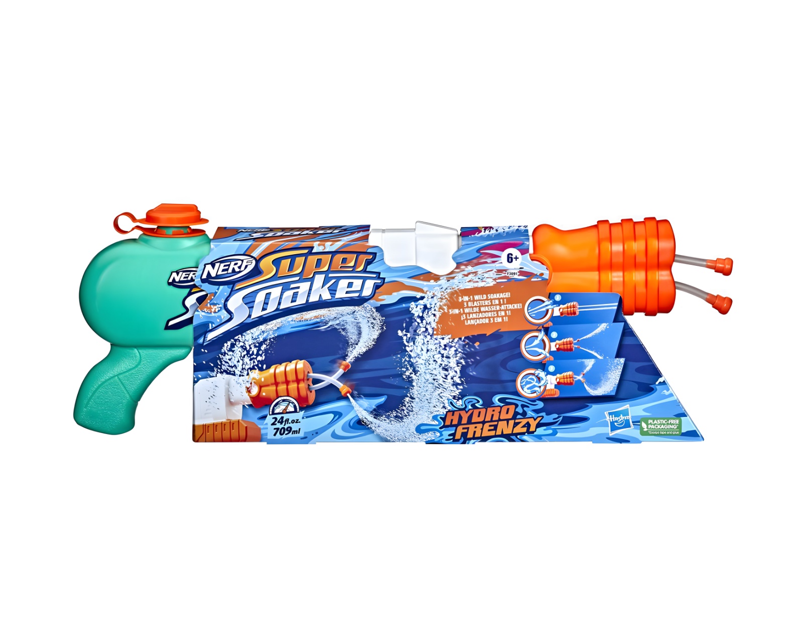Super Soaker - Hydro Frenzy ist ein Wasserblaster von Nerf, der eine 3-in-1-Belästigungsfunktion mit anpassbaren Strömen bietet. Er hat eine Kapazität von 709 ml (24 oz) und ist so konzipiert, dass er maximalen Wasserspaß beim Spielen im Freien bietet. Mit seinem innovativen Doppelschlauchsysteam kann der Benutzer breite Ströme erzeugen oder sich auf präzisere zielgerichtete Strahlen konzentrieren. Ein einfacher Pumpmechanismus ermöglicht es, schnell mit dem Benässen anderer zu beginnen.Der Hydro Frenzy Wasserblaster ist mit dem Fokus auf Funktionalität und Benutzerfreundlichkeit konzipiert. Er besteht aus einem Tank mit einem Volumen von 709 ml, was langanhaltendes Spielen ohne häufige Nachfüllungen ermöglicht. Die einstellbare Düse ermöglicht die Anpassung der Breite und Richtung des Wasserstrahls, was das Erlebnis in verschiedenen Spielsituationen verbessert. Mit dem Doppelschlauch-Design kann der Benutzer gleichzeitig zwei Ströme abfeuern, was die Wasserverteilung erhöht und die Voraussetzungen für komplexe Wasserschlachten schafft.