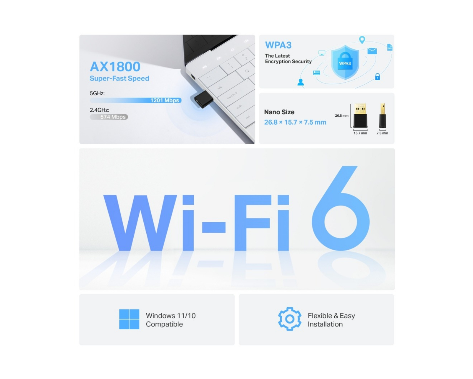 Archer TX20U Nano ist ein drahtloser USB-Adapter von TP-Link, der eine schnelle und zuverlässige Verbindung über Wi-Fi 6 bietet. Dieser kompakte Adapter liefert Geschwindigkeiten von bis zu 1201 Mbps im 5 GHz-Band und 574 Mbps im 2,4 GHz-Band, was ihn ideal für Gamer und Netzwerkbegeisterte macht, die hohe Leistung verlangen. Mit seinen Dual-Band-Funktionen ermöglicht er eine flexible Verbindung ohne Störungen, sodass die Benutzer ein reibungsloses Online-Erlebnis genießen können.Die fortschrittliche Technik des Adapters, einschließlich OFDMA und MU-MIMO, gewährleistet eine niedrigere Latenz und effizientere Datenübertragung an mehrere Geräte gleichzeitig. Die kompakten Abmessungen von 26,8 x 15,7 x 7,5 mm machen ihn leicht tragbar und einfach zu installieren; außerdem ist der Treiber vorinstalliert, was die Einrichtung vereinfacht. Archer TX20U Nano ist auch mit Windows 11/10 kompatibel, was ihn zu einer vielseitigen Lösung für verschiedene Benutzer macht. Mit dem Sicherheitsprotokoll WPA3 erhalten Sie zudem einen verbesserten Schutz vor Cyber-Bedrohungen.