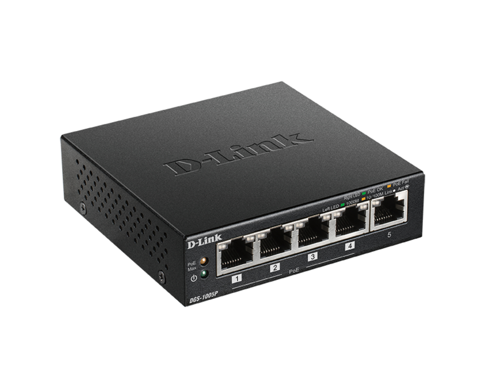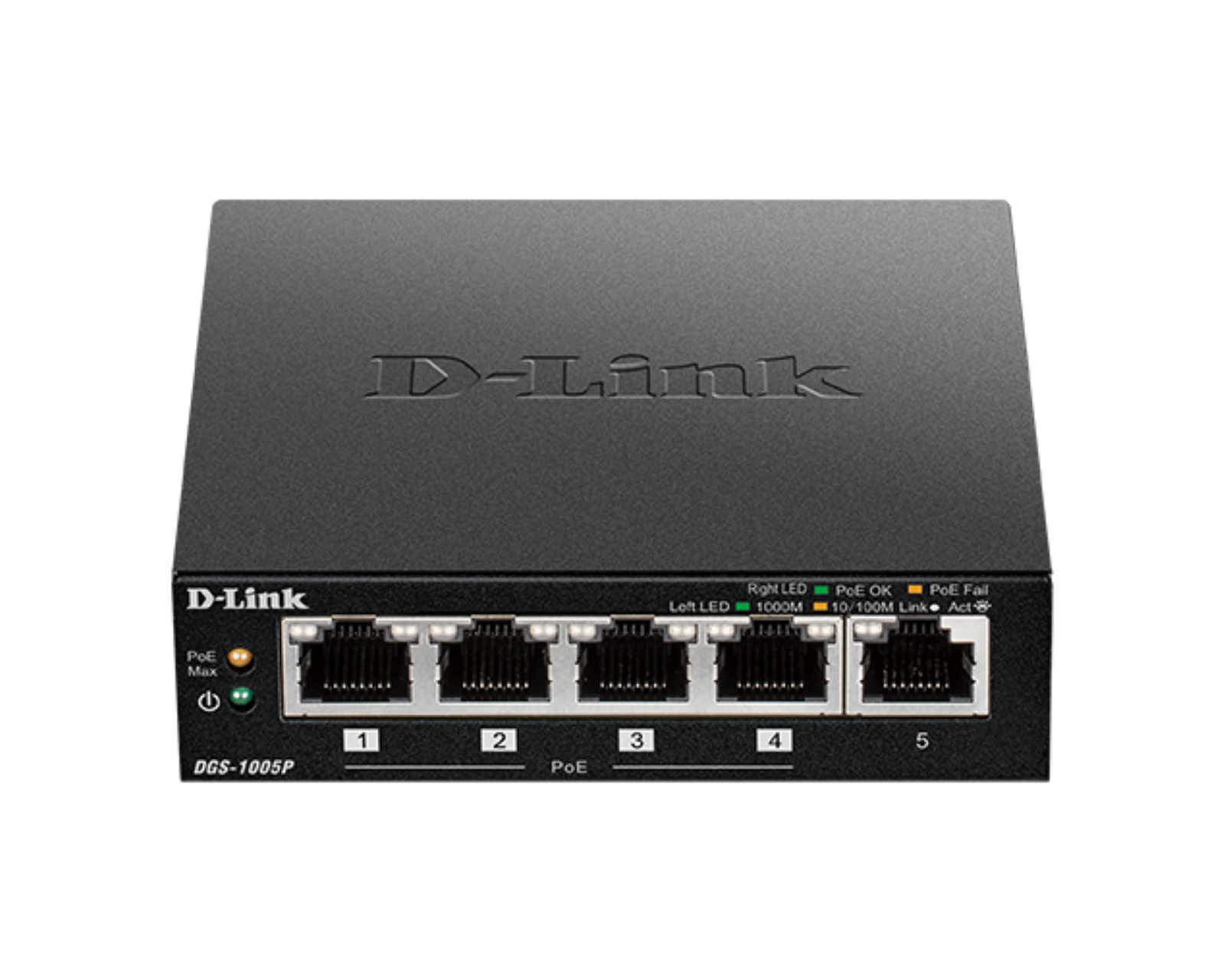 DGS-1005P ist ein 5-Port-Desktop-Gigabit-PoE+-Switch von D-Link. Dieses Gerät ermöglicht den Anschluss von Power over Ethernet (PoE)-Geräten wie drahtlosen Access Points, Netzwerk-Kameras und IP-Telefonen. DGS-1005P verfügt über eine Gesamtschaltkapazität von 10 Gbps und ein PoE+-Budget von 60W, wodurch es sich für Zuhause und kleine Unternehmen eignet.DGS-1005P ist mit fünf Gigabit-Ethernet-Ports ausgestattet, von denen vier IEEE 802.3af und 802.3at PoE unterstützen und bis zu 30 W an jedem PoE-Port bereitstellen. Das Gerät benötigt keine Konfiguration und bietet Plug-and-Play-Funktionen für eine einfache Installation. Die automatische MDI/MDI-X-Unterstützung beseitigt den Bedarf an Crossover-Kabeln, und die intelligente Geschwindigkeitsregelung an jedem Port gewährleistet die Kompatibilität mit angeschlossenen Geräten. Mit einem lüfterlosen Design arbeitet DGS-1005P geräuschlos, was es für lärmempfindliche Umgebungen geeignet macht.