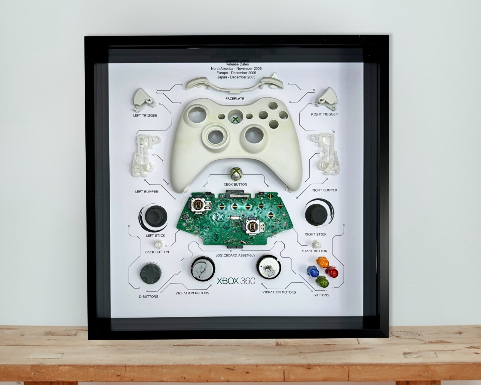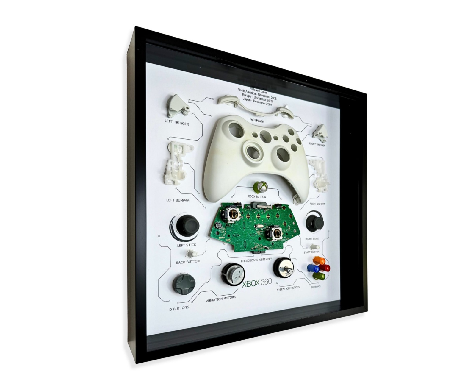 Retro Art Microsoft Xbox 360 Wireless Controller Display ist ein Produkt von GRC, das als visuelle Präsentation des drahtlosen Xbox 360-Controllers fungiert. Es ist handgefertigt mit authentischen Originalteilen von Xbox 360, was ein einzigartiges und retro-inspiriertes Design ergibt.Jedes Teil ist sorgfältig in einem harmonischen Layout angeordnet und wird mit einem informativen Etikett geliefert, das den Ursprung und das Beziehungsdatum jedes Bauteils beschreibt. Zum Schutz ist die Anzeige mit einem robusten Glas ausgestattet und in einem Metallrahmen montiert.