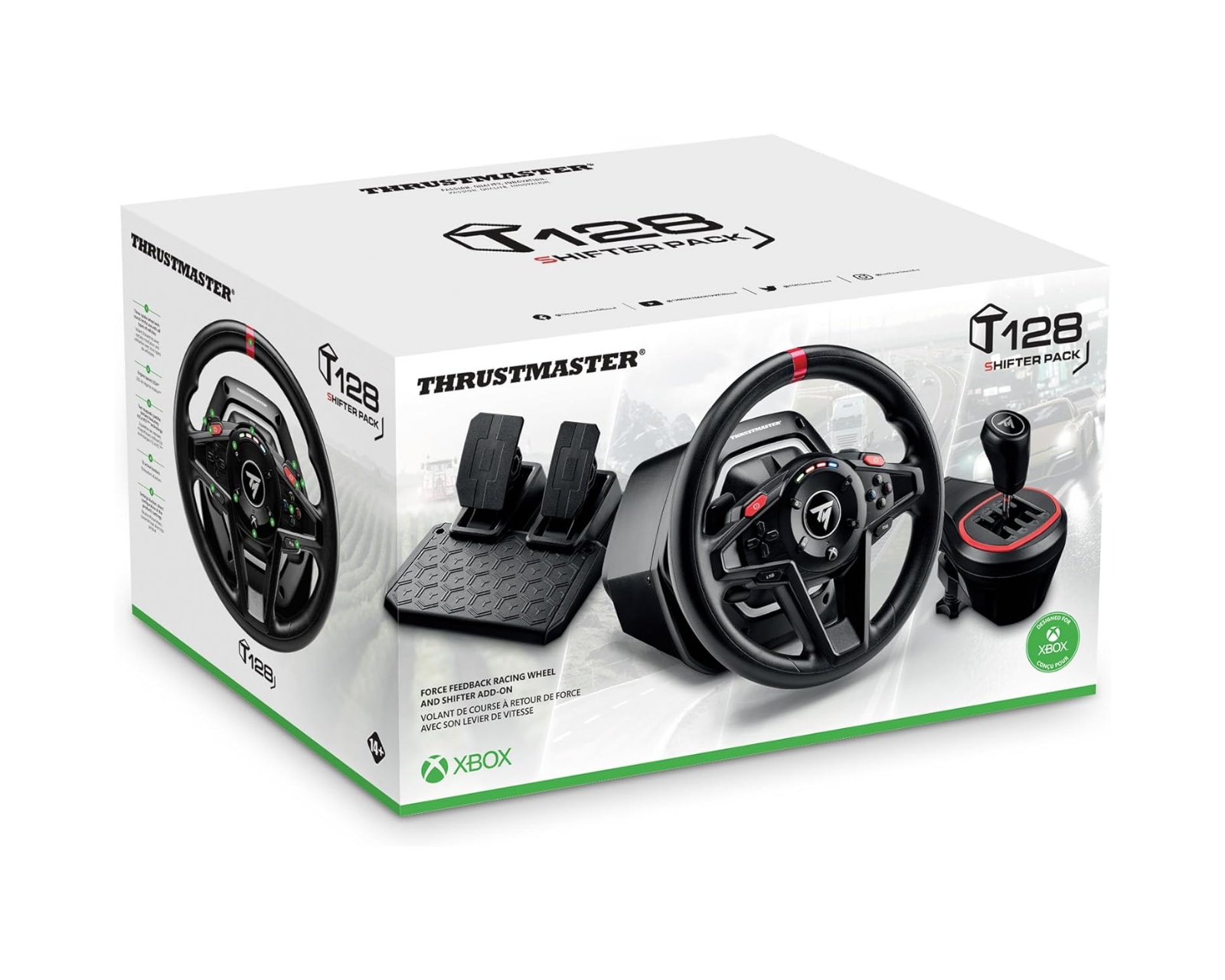 T128-X Shifter Pack ist ein Lenkrad- und Schalthebelpaket von Thrustmaster, das ein beeindruckendes Sim-Racing-Erlebnis bietet. Mit der dynamischen Force Feedback-Technologie und dem leichten Lenkrad hilft dir dieses Paket, jede Kurve zu spüren und die Straße zu erobern. Der enthaltene TH8S Shifter Add-On ermöglicht es, manuell mit einem "H"-gemusterten Schaltplatt zu schalten, was direkten Zugang zu sieben Gängen und einem Rückwärtsgang bietet, perfekt für eine Vielzahl von Fahrzeugen und Spielen.Die Konstruktion des T128-Lenkrads ist sowohl modern als auch ergonomisch mit einem Drehwinkel von bis zu 900°, was Flexibilität für verschiedene Rennspiele und Rennstile gewährleistet. Die magnetischen Paddleschaltungen bieten eine schnelle und präzise Reaktion, während die reibungslose H.E.A.R.T-Technologie im Schalthebel sicherstellt, dass die Präzision über die Zeit erhalten bleibt, ohne von Abnutzung beeinflusst zu werden. T128-X Shifter Pack ist außerdem vollständig kompatibel mit PC (Windows 10/11), Xbox Series X|S und Xbox One, was es zu einer vielseitigen Lösung für Gamer macht.