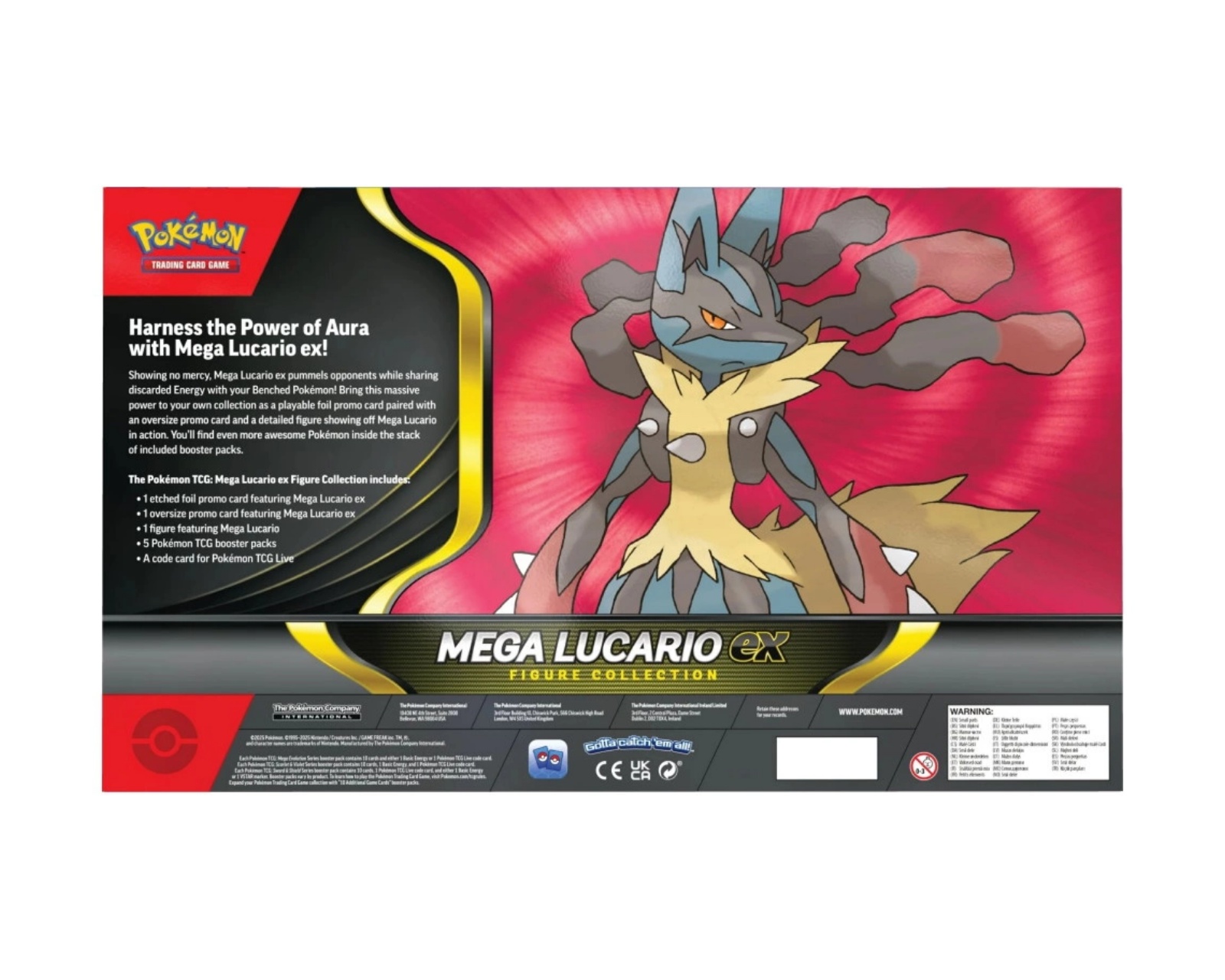 Die Sammlung umfasst eine geätzte Foil-Promokarte mit Mega Lucario ex, eine übergroße Promokarte, eine detailreiche Figur und fünf Booster-Packs aus Pokémon TCG. Darüber hinaus liegt eine Codekarte für Pokémon TCG Live bei, die zusätzliche Möglichkeiten für Spiel und Interaktion bietet. Diese Figurenkollektion ist für diejenigen gedacht, die ihre Sammlung erweitern und die starken Eigenschaften von Mega Lucario in ihren Spielstrategien nutzen möchten.
