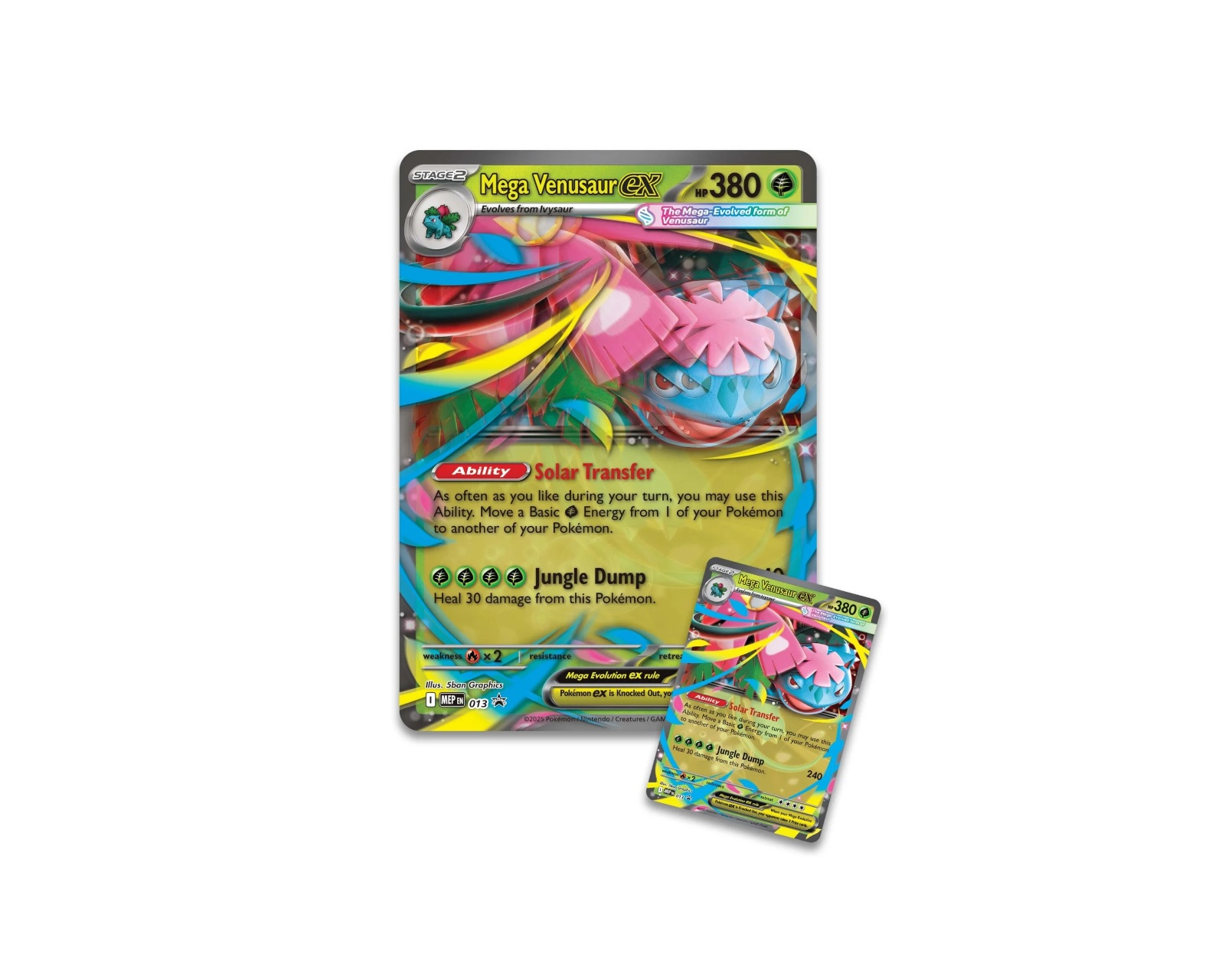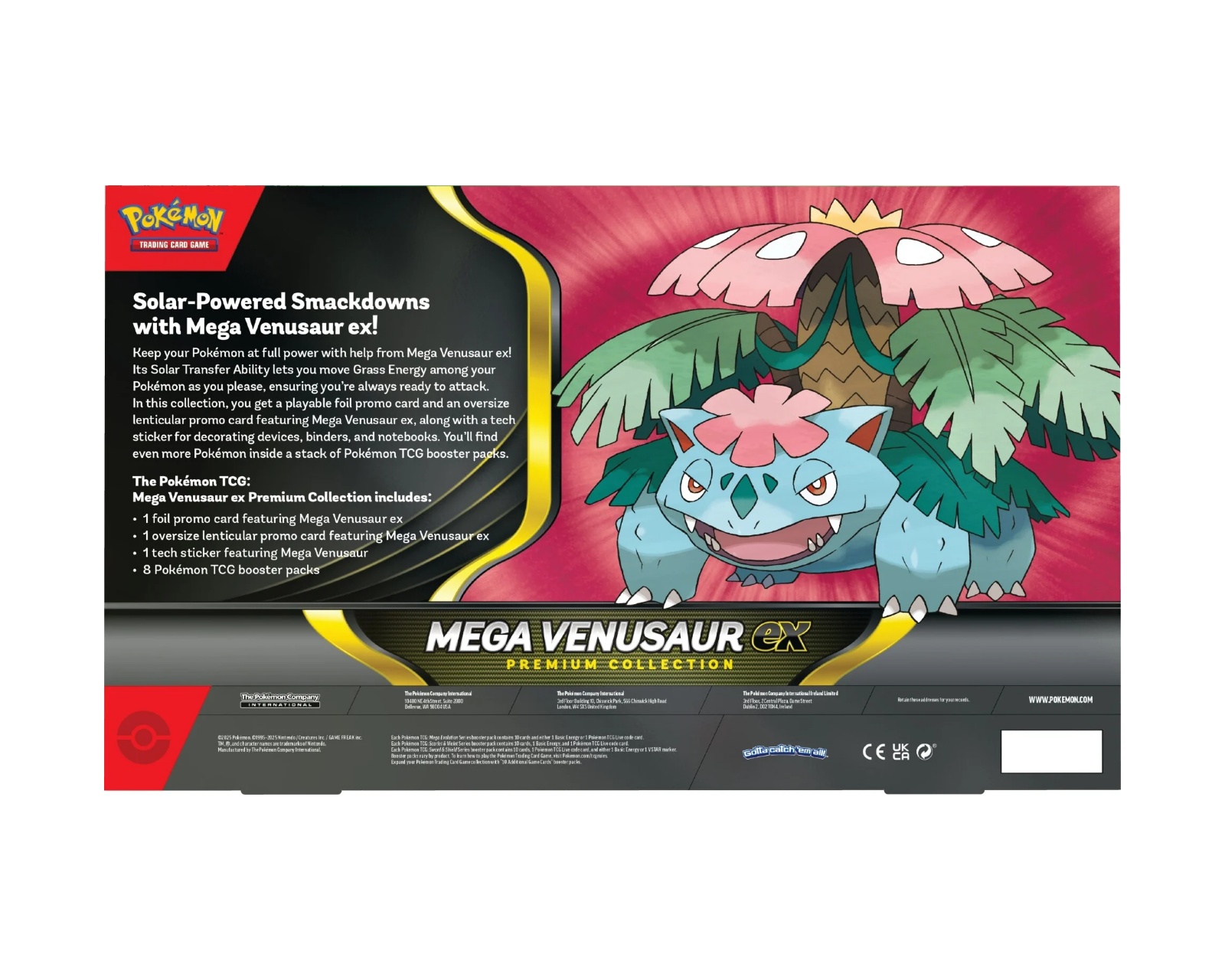 Max 1 pro Kunde.Die Mega Venusaur ex Premium Collection ist eine Sammlung von Produkten aus Pokémon, die eine Kombination aus spielbaren Karten und Sammlerstücken enthält. Die Sammlung beinhaltet eine Foil-Promo-Karte, die Mega Venusaur ex zeigt, eine große lentikuläre Promo-Karte derselben Figur sowie einen technischen Aufkleber zur Dekoration. Dieses Paket ist ideal für Gamer, die daran interessiert sind, ihre Decks mit kraftvollen Karten zu verstärken und einzigartige Objekte zu sammeln. Es gibt auch eine Stapel von Pokémon TCG Booster-Packs, um die Sammlung zu erweitern.