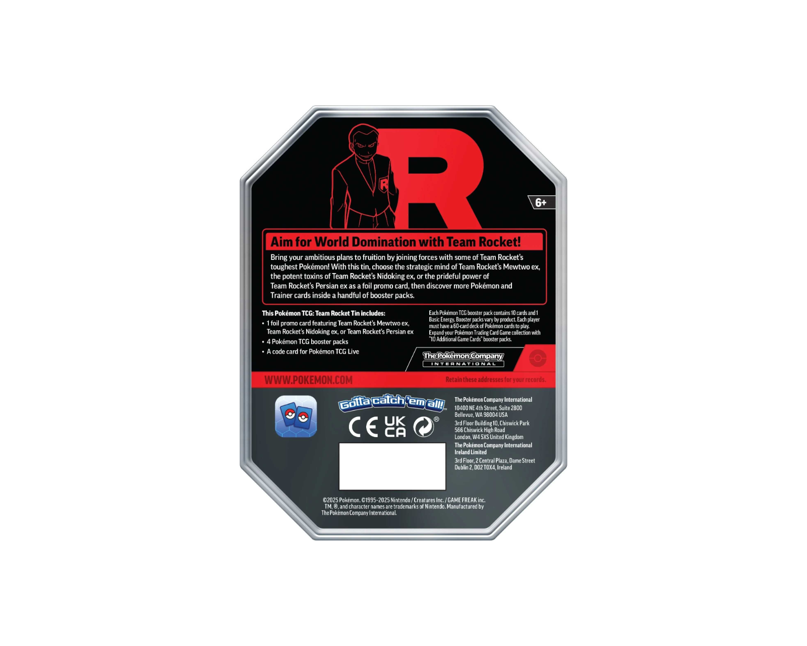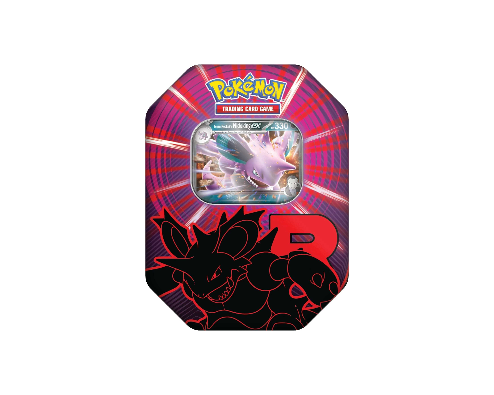 Pokémon TCG: Team Rocket Tin ist eine Aufbewahrungsbox für Karten des Pokémon-Sammelkartenspiels des Herstellers Pokémon. Diese Box enthält eine von drei möglichen Folien-Promokarten, darunter Team Rockets Mewtwo ex, Team Rockets Nidoking ex oder Team Rockets Persian ex. Sie richtet sich an Sammler und Spieler, die ihre Kartensammlung erweitern und diese mächtigen Pokémon strategisch einsetzen möchten. Die Box enthält außerdem vier Boosterpacks mit weiteren Pokémon- und Trainerkarten sowie einen Code für Pokémon TCG Live.Die Box besteht aus strapazierfähigem Material und bietet eine gute Aufbewahrungsmöglichkeit für Karten. Jede Dose ist so konzipiert, dass der Inhalt vor Beschädigungen geschützt ist und verfügt über einen Mechanismus, der einen sicheren Verschluss gewährleistet. Booster-Packs enthalten verschiedene Karten, darunter seltene und wertvolle Karten, die das Spielerlebnis verbessern können. Darüber hinaus ist der mitgelieferte Code nützlich, um Inhalte online freizuschalten und dem Spiel eine digitale Dimension zu verleihen.