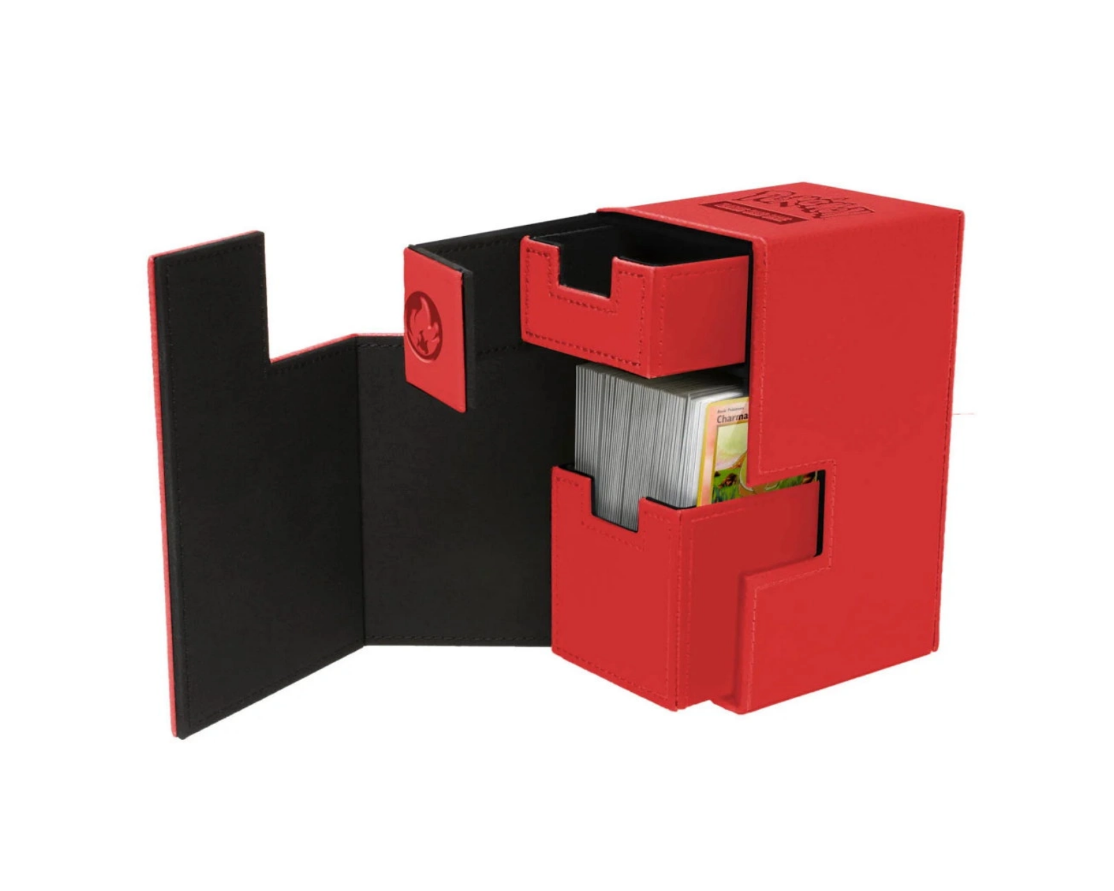 Die Ultra Pro Charmander M2 Deck Box ist eine Aufbewahrungsbox für Sammler des Pokémon-Sammelkartenspiels. Sie besticht durch ihr stilvolles Design mit einer geprägten Charmander-Illustration in Rot. Hergestellt aus mattem Kunstleder und ausgestattet mit einem Magnetverschluss bietet sie sicheren Schutz für die Karten. Das Hauptfach bietet Platz für bis zu 75 Standard-Doppelhüllen.Eine ausziehbare Schublade für Würfel, Marker und anderes Zubehör erleichtert die Organisation der Spielgegenstände.