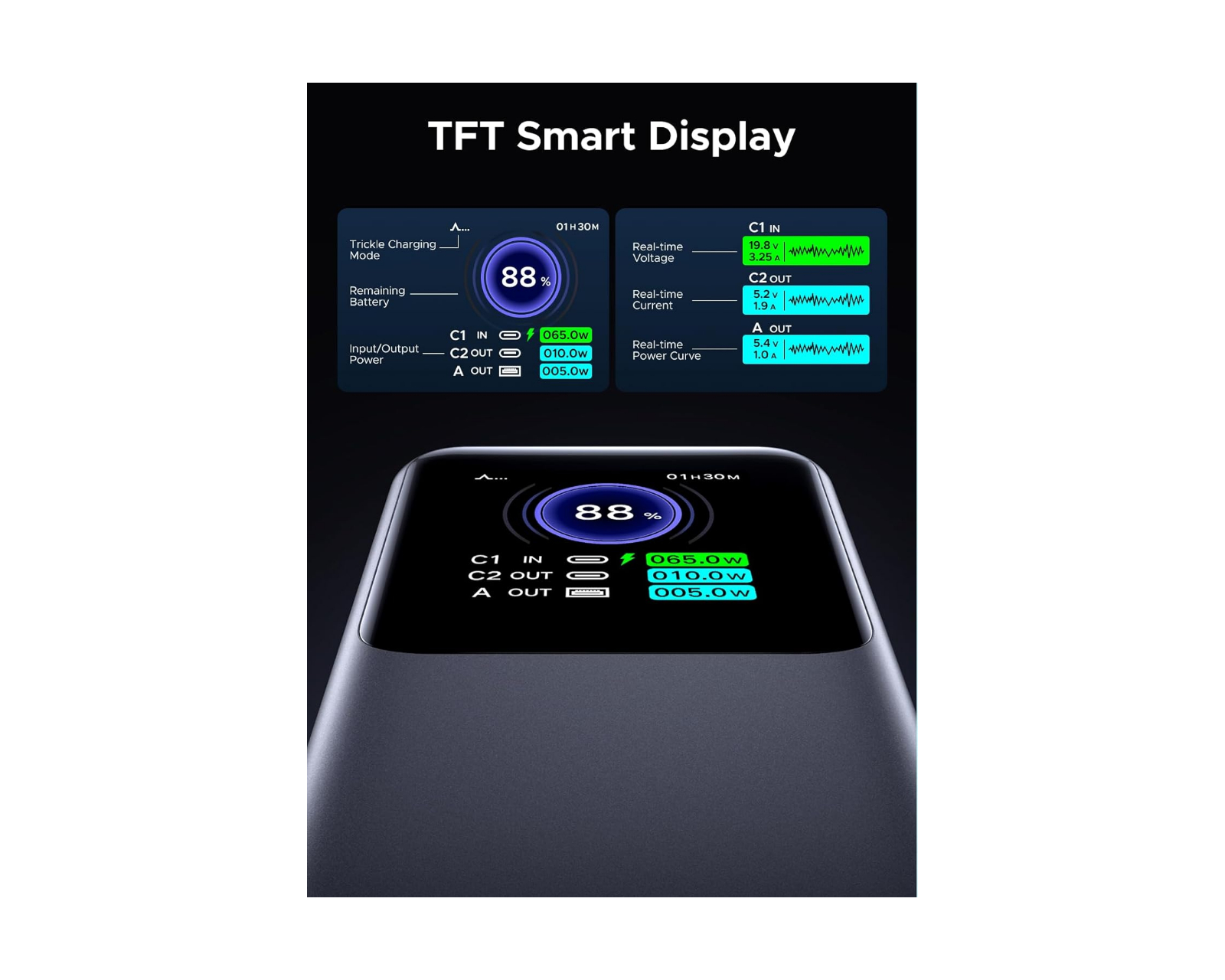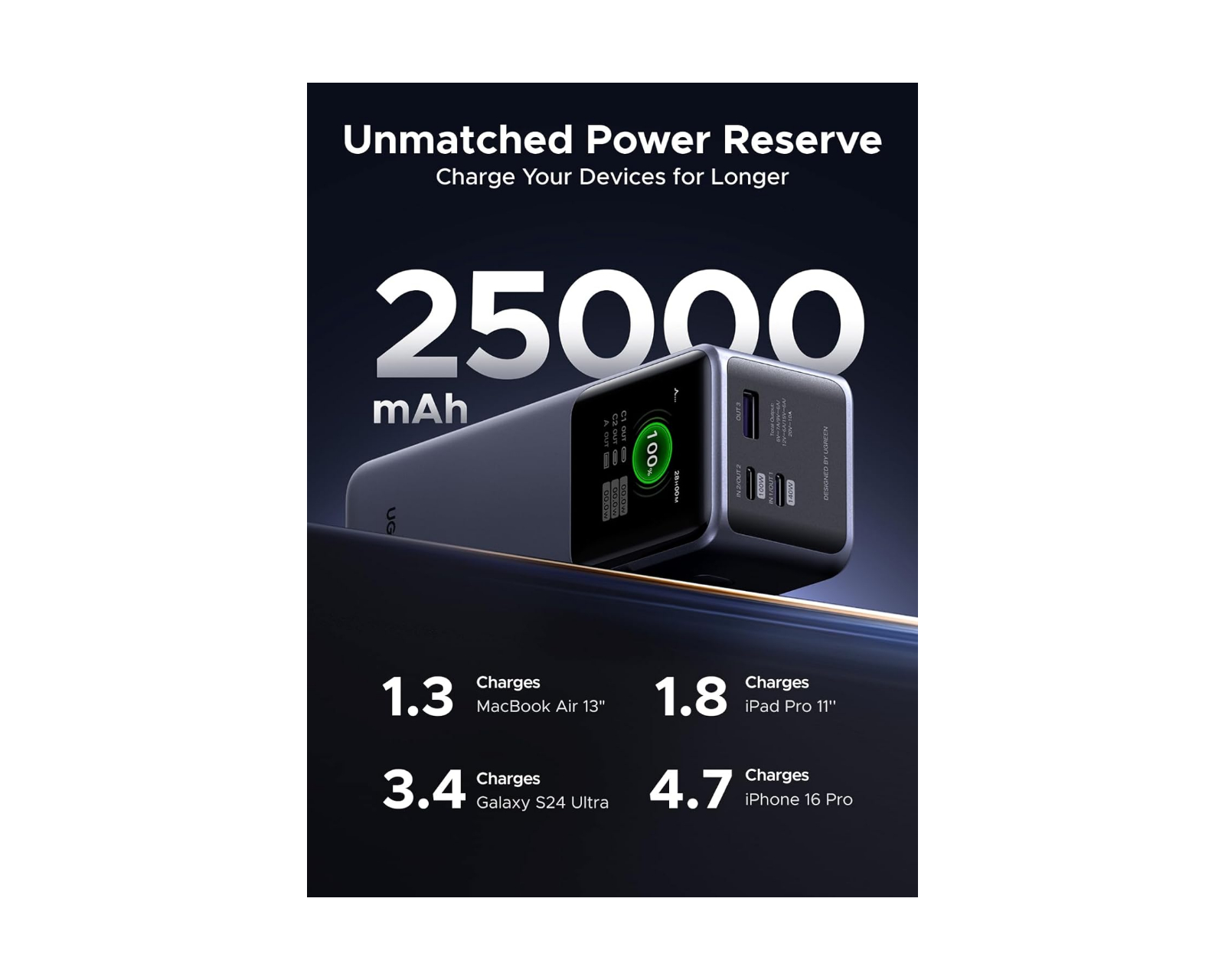 Powerbank mit Schnellladefunktion, die über eine beeindruckende Kapazität von 200 W und 25.000 mAh verfügt und sich somit perfekt eignet, um Ihre Geräte den ganzen Tag über aufgeladen zu halten. Es verfügt über zwei USB-C-Anschlüsse und einen USB-A-Anschluss, sodass Sie mehrere Geräte gleichzeitig laden können. Darüber hinaus ist es mit einem TFT-Bildschirm ausgestattet, der den aktuellen Akkustand und Ladestatus anzeigt und Ihnen so einen klaren Überblick darüber gibt, wie viel Energie noch übrig ist.Das leichte Design der Powerbank macht sie ideal für Reisen und den täglichen Gebrauch. Dank seiner kompakten Größe finden Sie problemlos Platz, um es überall hin mitzunehmen, was es zum perfekten Begleiter sowohl für Geschäftsreisen als auch für Freizeitabenteuer macht. Ganz gleich, ob Sie auf dem Weg zur Arbeit oder auf einem Wochenendausflug sind oder Ihr Gerät nur tagsüber aufladen müssen, diese Powerbank bietet eine praktische und bequeme Lösung, um Ihre Geräte aufgeladen und einsatzbereit zu halten.