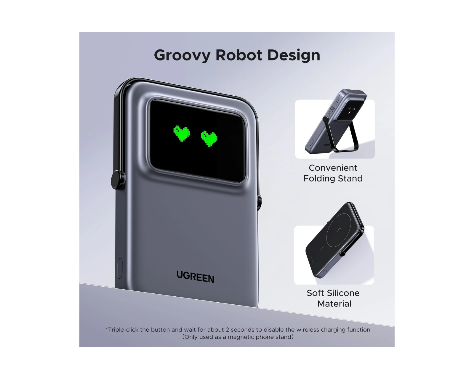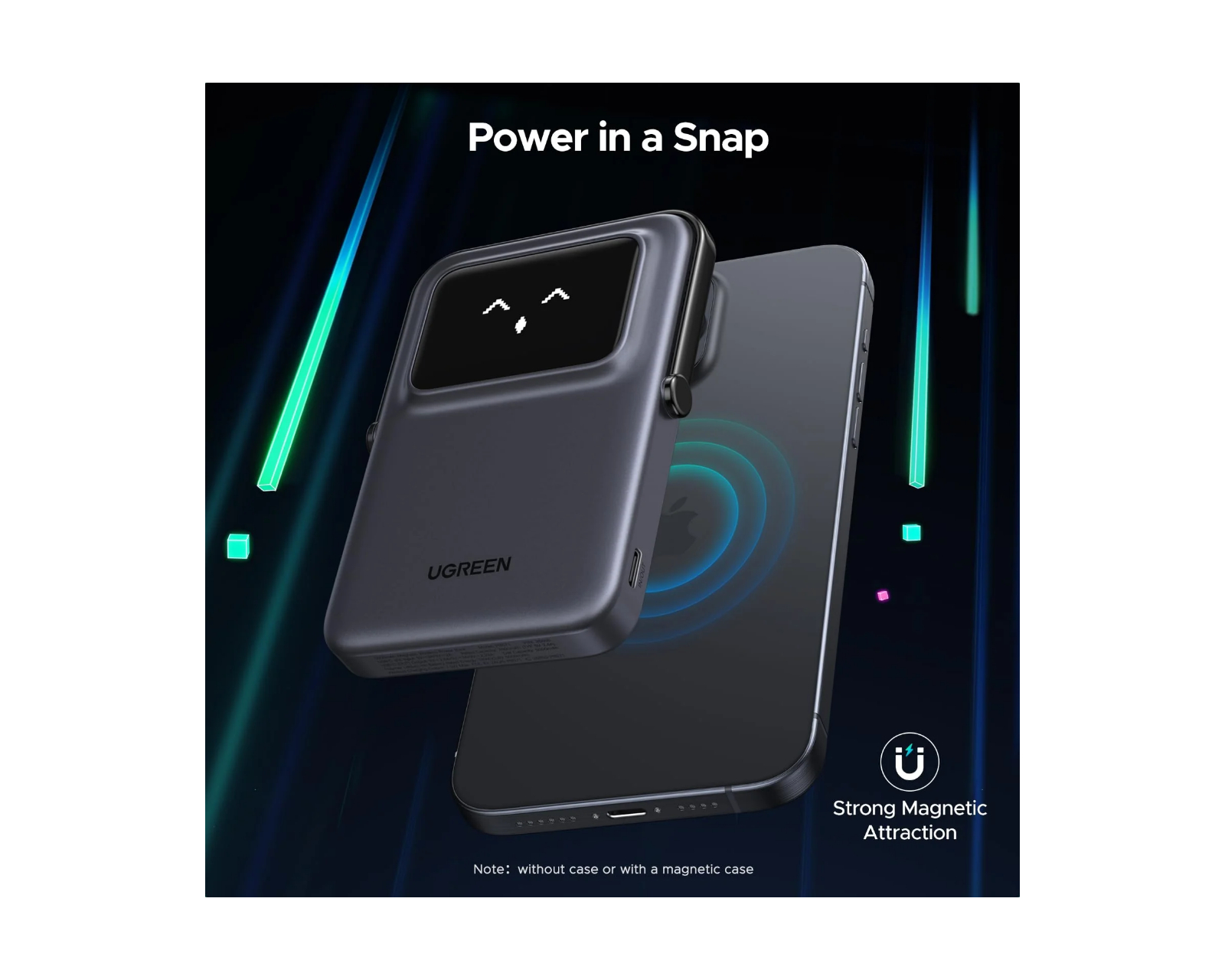 Die Uno 5000mAh Magnetic Wireless Powerbank ist eine Powerbank von UGREEN, die effizientes Laden mit 20 W und kabelloses Laden mit Magnetfunktion bietet. Mit einer Akkukapazität von 5000 mAh eignet sie sich zum effizienten Laden verschiedener Geräte. Die Powerbank ist außerdem mit einem Smart-Display ausgestattet, das den Status durch Emojis anzeigt. Sie ist sowohl für den alltäglichen als auch für den anspruchsvollen Einsatz konzipiert.Die Powerbank verfügt über einen USB-C-Ein-/Ausgang, der 5 V/3 A, 9 V/2,22 A und 12 V/1,5 A unterstützt und eine maximale Leistung von 20 W bietet. Darüber hinaus verfügt sie über kabelloses Laden mit einer Leistung von 7,5 W. Dank mehrerer Schutzfunktionen gegen Überladung, Tiefentladung, Überstrom, Überlastung, Überspannung, Übertemperatur, Kurzschluss und elektromagnetische Felder ist das Gerät sicher und zuverlässig.