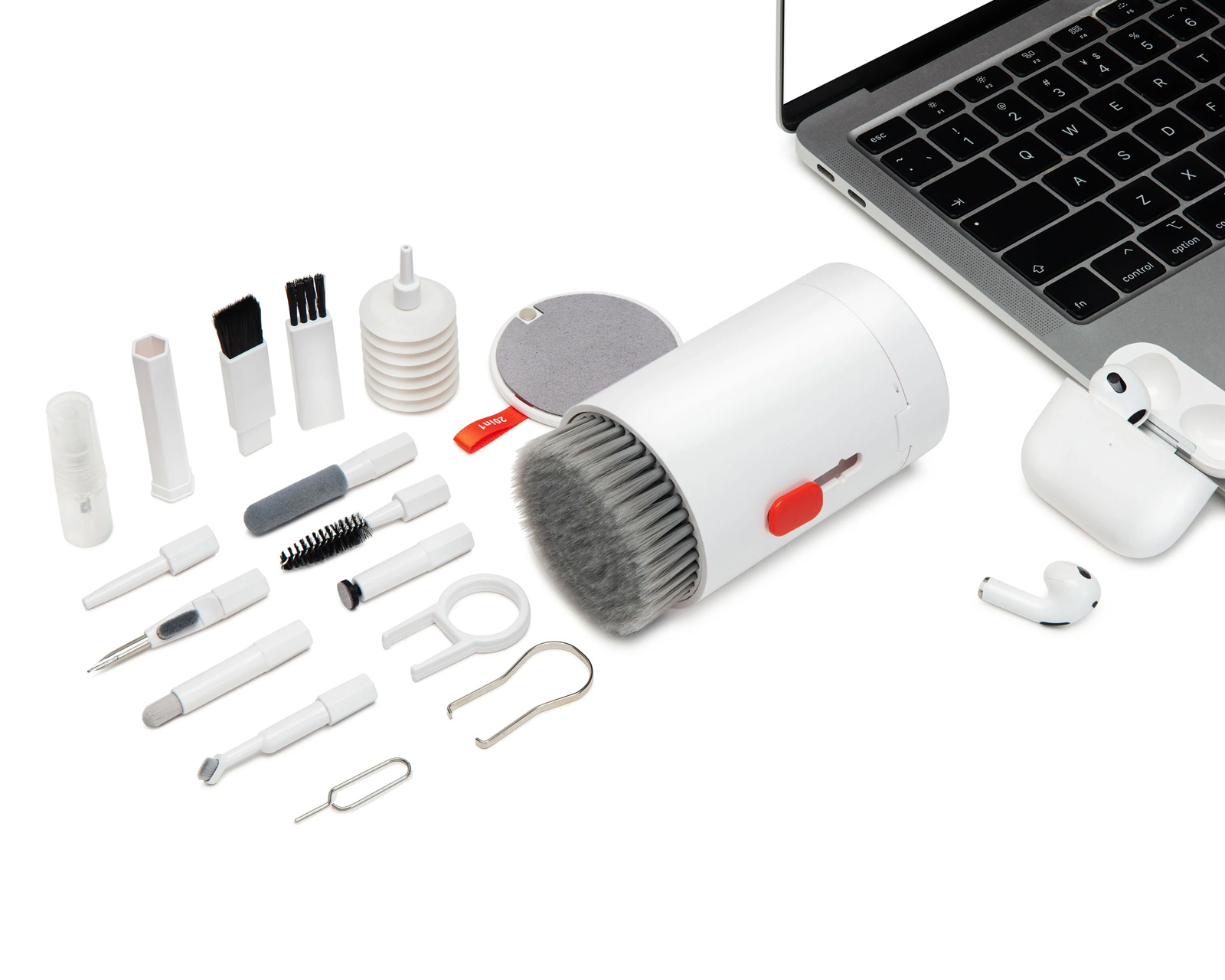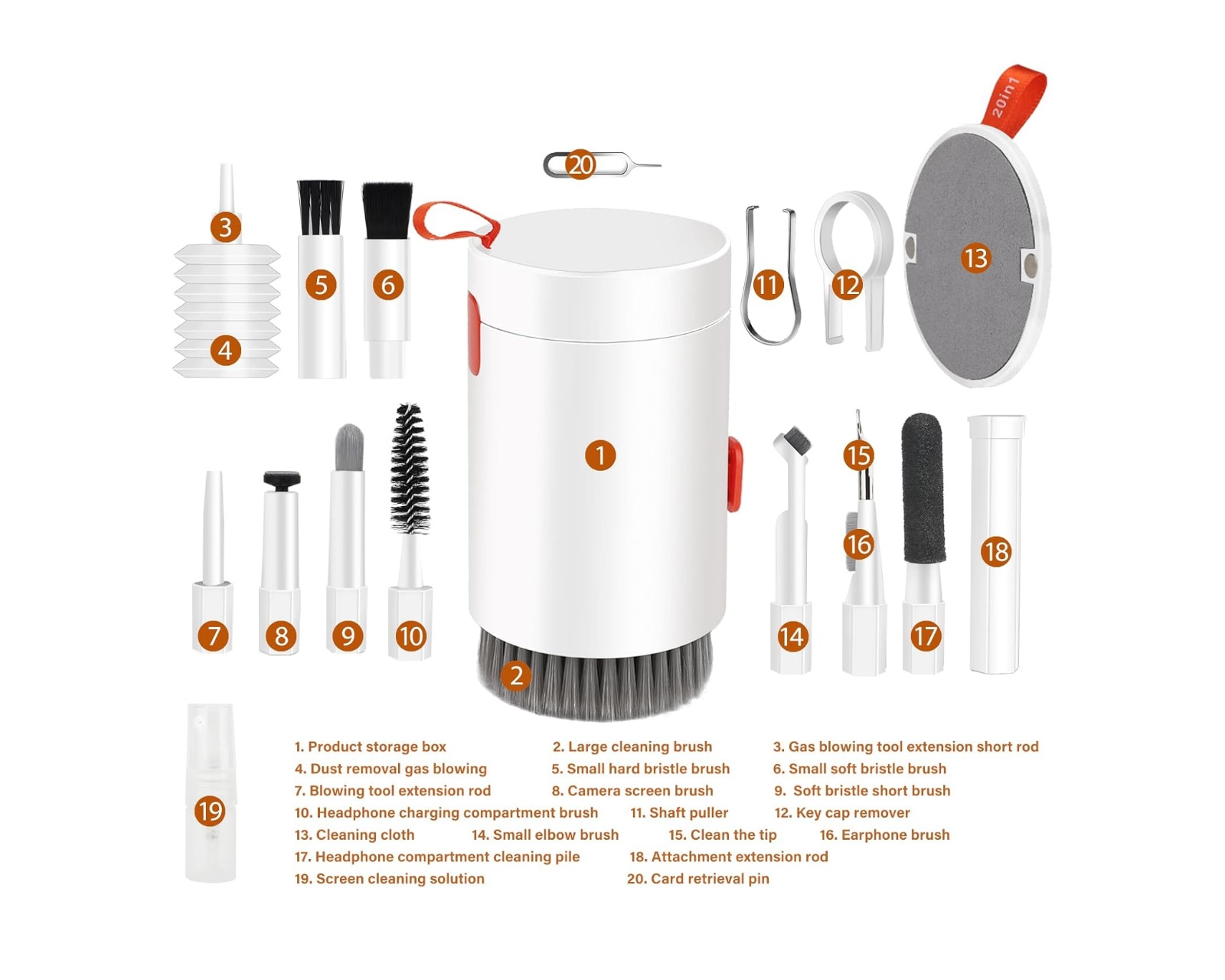 20-i-1 Reinigungsset ist ein Reinigungsset für Elektronik von MaxMount, das darauf abzielt, die Wartung verschiedener elektronischer Geräte zu erleichtern. Das Set enthält 20 Teile, einschließlich verschiedener Arten von Bürsten, Reinigungstuch, Druckluftbläser und Aufbewahrungsetui. Es eignet sich zur Reinigung von Mobiltelefonen, Tablets, Computerzubehör und anderen elektronischen Geräten.Das Reinigungskit enthält mehrere Spezialwerkzeuge, die es dem Benutzer ermöglichen, schwer zugängliche Bereiche in kleinen elektrischen Geräten zu erreichen. Die Bürsten umfassen eine große Reinigungsbürste für Staub auf größeren Flächen, eine kleine Bürste mit harten Borsten für festsitzenden Schmutz sowie spezialisierte Bürsten für Kopfhörer und Ladekoffer. Das Reinigungstuch besteht aus Mikrofaser und gewährleistet eine kratzfreie Reinigung von Bildschirmen. Ein Luftbläser hilft dabei, Staub schneller von schwer zugänglichen Stellen zu entfernen. Das Aufbewahrungsetui sorgt dafür, dass alle Werkzeuge organisiert gehalten werden.
