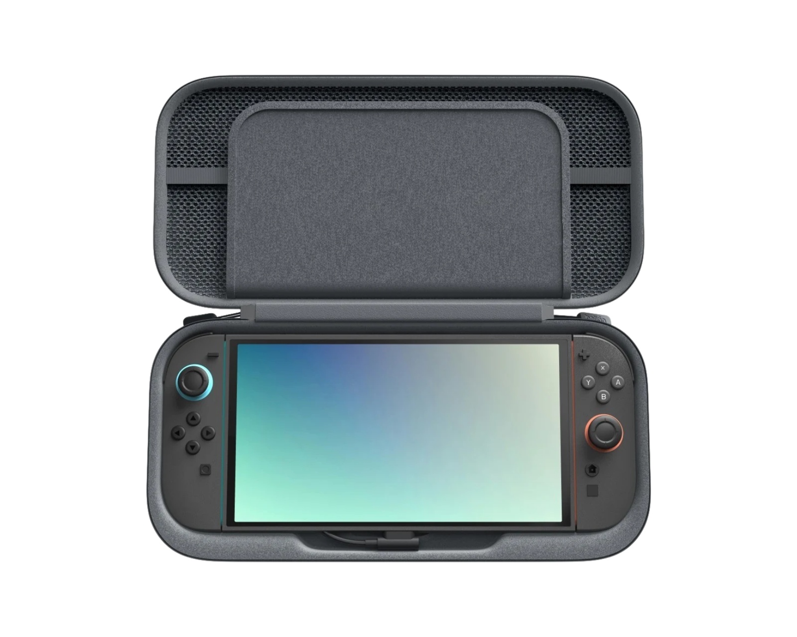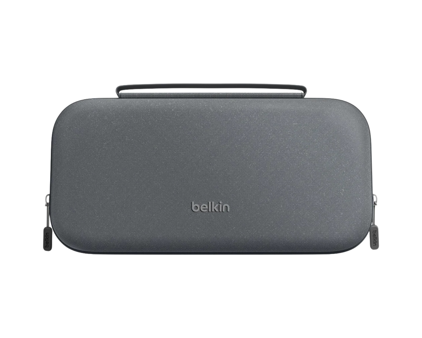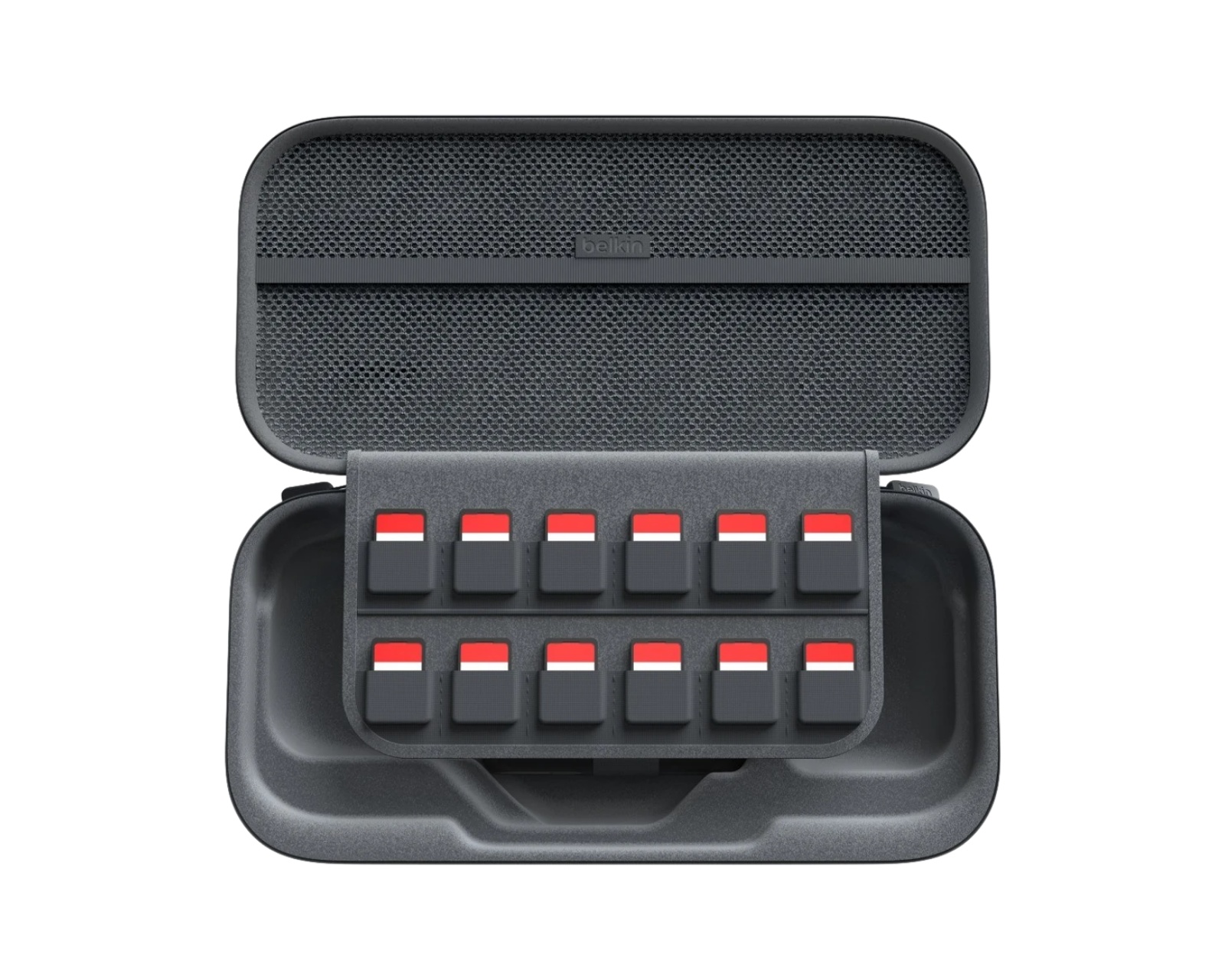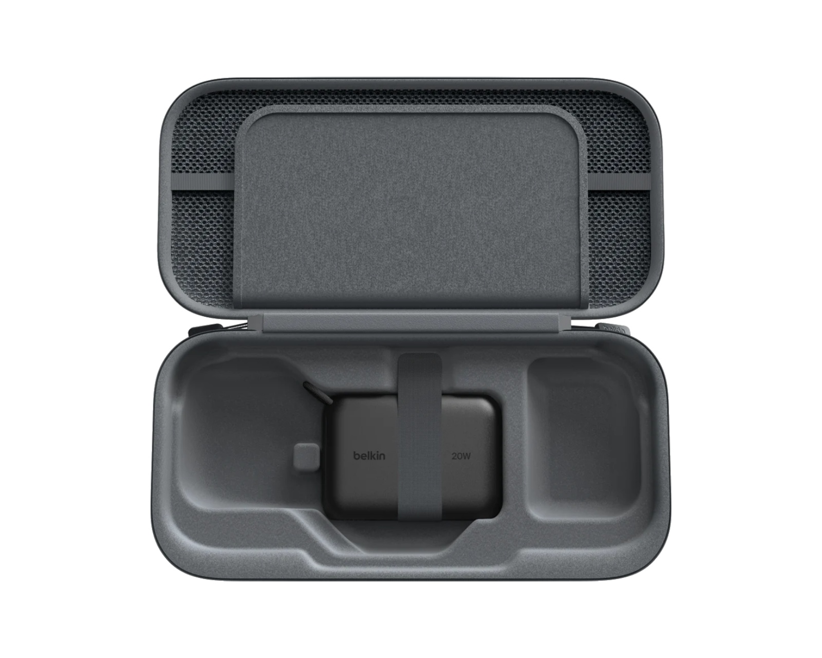 Belkin Switch 2 Ladeetui mit Powerbank ist ein Ladeetui für Nintendo Switch 2, das Schutz und Stromversorgung kombiniert. Es enthält eine abnehmbare Powerbank mit 10.000 mAh, die das Gerät bis zu 1,5 Mal aufladen kann, was es praktisch für lange Spielesessions und Reisen macht. Das Etui bietet auch Platz für Spielkarten und eine Unterstützung für Tischspielen, was die Verwendung überall erleichtert.Das Etui ist aus wasserabweisendem Stoff gefertigt und verfügt über eine robuste äußere Hülle, die vor Kratzern und Stößen schützt. Das interne Fach für Spielkarten fasst bis zu zehn Stück. Das Gerät hat außerdem einen LCD-Bildschirm, der den Ladezustand anzeigt, sodass der Nutzer immer über die verbleibende Batterielaufzeit informiert ist. Gleichzeitig enthält das Etui ein verstecktes Fach für AirTag zur Tracking-Möglichkeit.