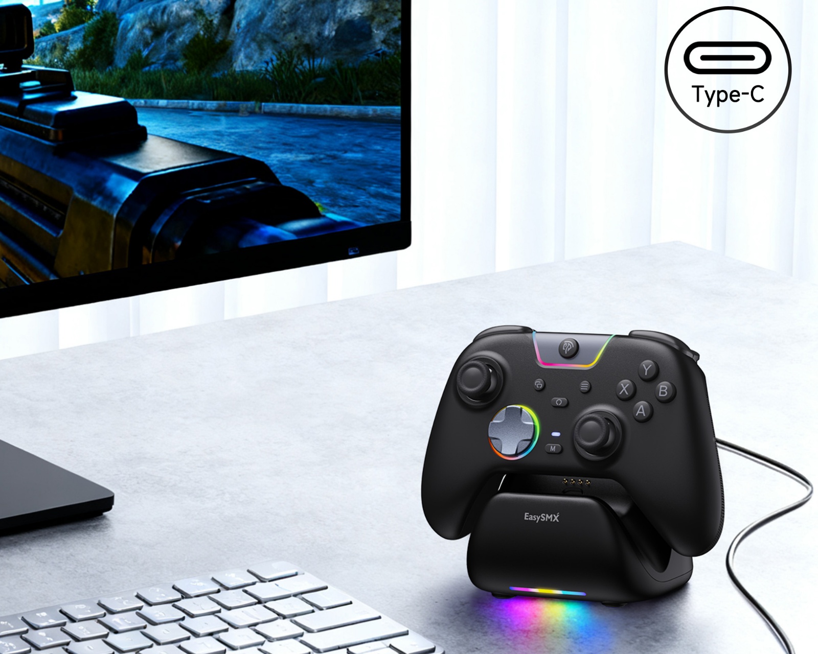 EasySMX X05Pro Ladestation ist eine Dockinglösung, die sich an Benutzer des EasySMX X05Pro kabellosen Controllers richtet. Das Produkt bietet einen sicheren und passgenauen Ständer, der den Controller stabilisiert und einfach über einen USB-C-Anschluss zu verwenden ist. Die Dock ist so konzipiert, dass sie eine saubere und zuverlässige Stromquelle ohne komplizierte Installationen bereitstellt.Die Dock ist mit einem speziellen Fach ausgestattet, um den kabellosen Empfänger zu lagern, was das Verlieren wichtiger Komponenten verhindert. Die stabile, rutschfeste Basis mit Silikonpolstern sorgt dafür, dass die Dock sicher auf allen Oberflächen steht und minimiert das Risiko, dass sie beim Benutzen rutscht oder umkippt. Ein erhöhter Betrachtungswinkel ermöglicht es, den Controller leicht auf dem Schreibtisch, Regalen oder im Spielzimmer zu präsentieren.