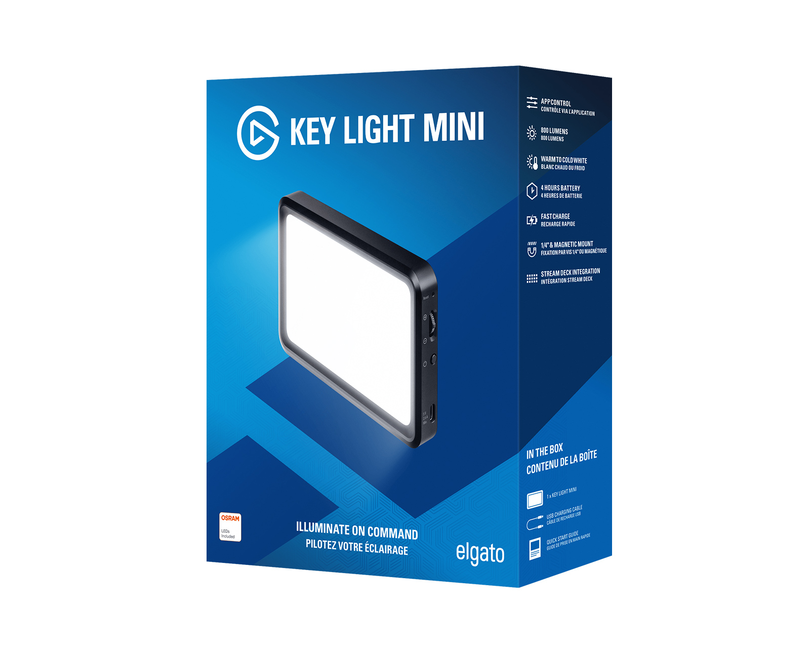 Key Light mini von Elgato ist das perfekte LED-Panel für Content Creator unterwegs. Das leichte und kompakte Design erleichtert den Transport, während die Helligkeit von 800 Lumen garantiert, dass Ihnen nichts entgeht.Key Light mini verfügt außerdem über hochwertige LED-Leuchten von OSRAM, die für flimmerfreie Videos sorgen und dafür sorgen, dass Ihre Inhalte gut aussehen. Und dank seiner Kompatibilität mit mehreren Montageoptionen können Sie es problemlos an jeder Oberfläche anbringen. Darüber hinaus können Sie dank der Integration mit Elgato Stream Deck (separat erhältlich) das Key Light mini per Knopfdruck steuern.
