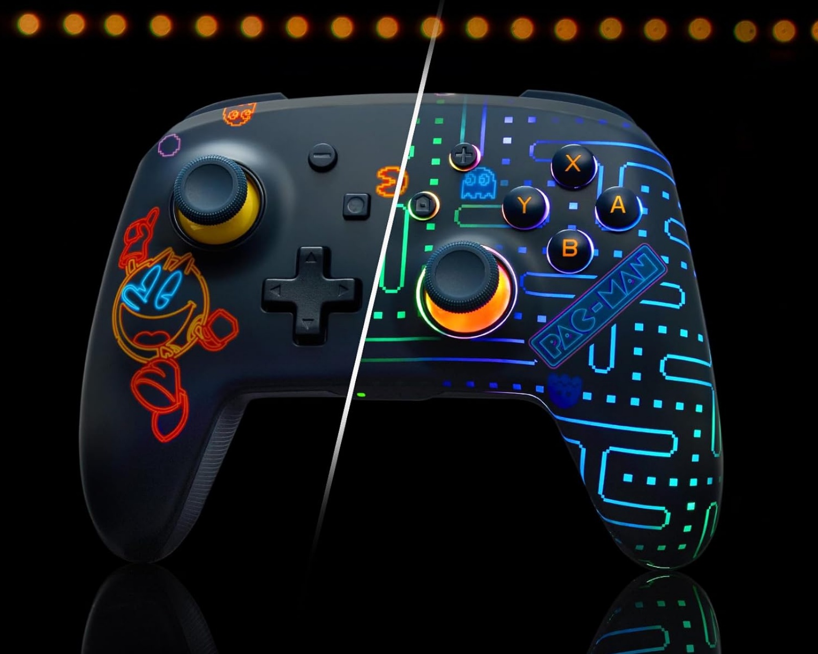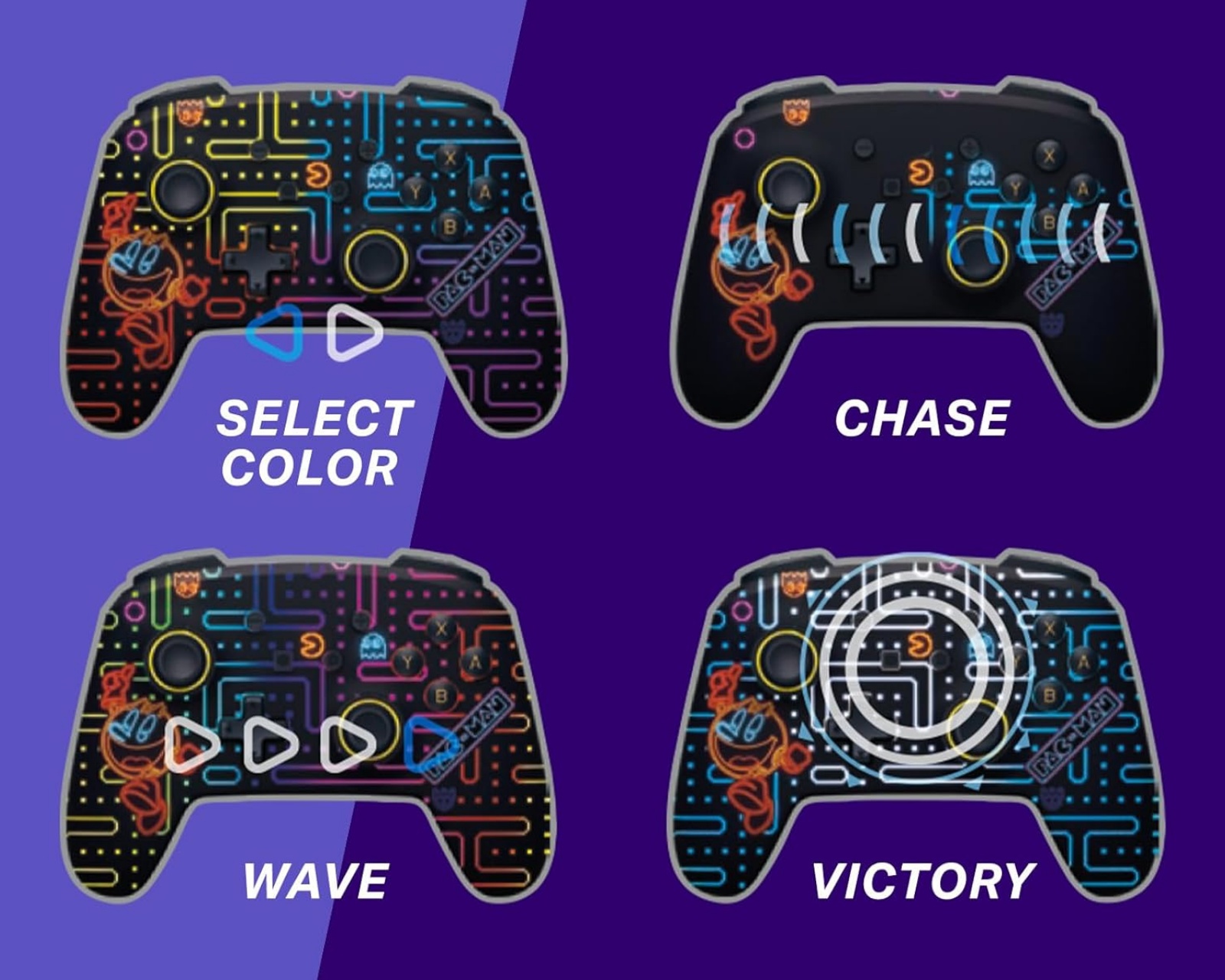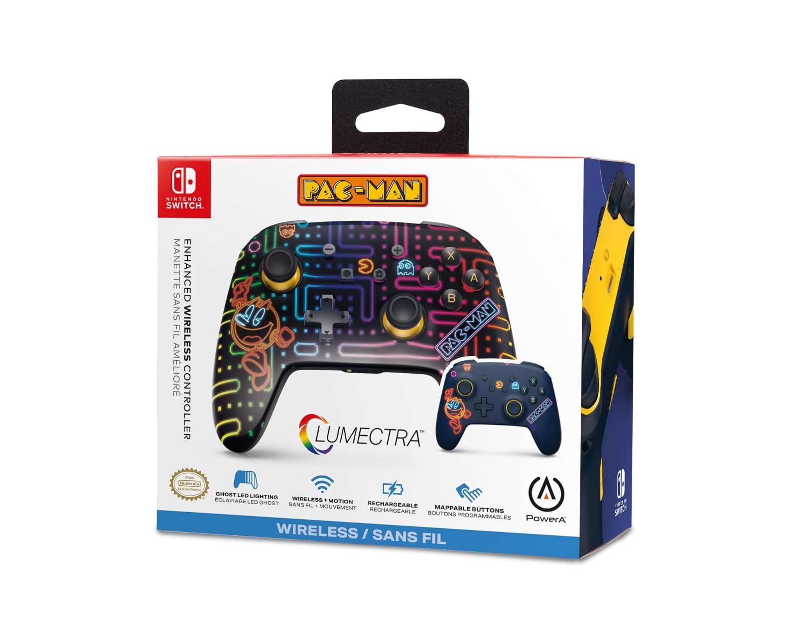 Erweiterter kabelloser Controller für Nintendo Switch - Pac Man (Neon Arcade) ist ein Spielcontroller von PowerA, der für die Verwendung mit Nintendo Switch, Nintendo Switch OLED Model und Nintendo Switch Lite entwickelt wurde. Der Controller verfügt über eine integrierte RGB-LED-Beleuchtung, die ein verborgenes PAC-MAN-Muster hervorhebt und vier einzigartige Lichtmodi bietet. Darüber hinaus bietet er fortschrittliche Spieltasten, die während des Spiels programmiert werden können, um die Leistung zu verbessern.Der Controller ist mit einem wiederaufladbaren Akku ausgestattet, der bis zu 10 Stunden Spielzeit bei einer einzigen Ladung bietet. Das mitgelieferte USB-C-Kabel ist 3 Meter lang, was gleichzeitiges Spielen und Laden ermöglicht. Dank des kabellosen Systems kann der Benutzer frei auf seiner Konsole spielen. Der Controller verfügt auch über Bewegungssensoren für eine reaktionsschnellere Spielkontrolle und intuitive Navigation im Spiel. Das ergonomische Design umfasst ein bekanntes Layout mit texturiertem Griff auf der Rückseite und texturierten Analogsticks.