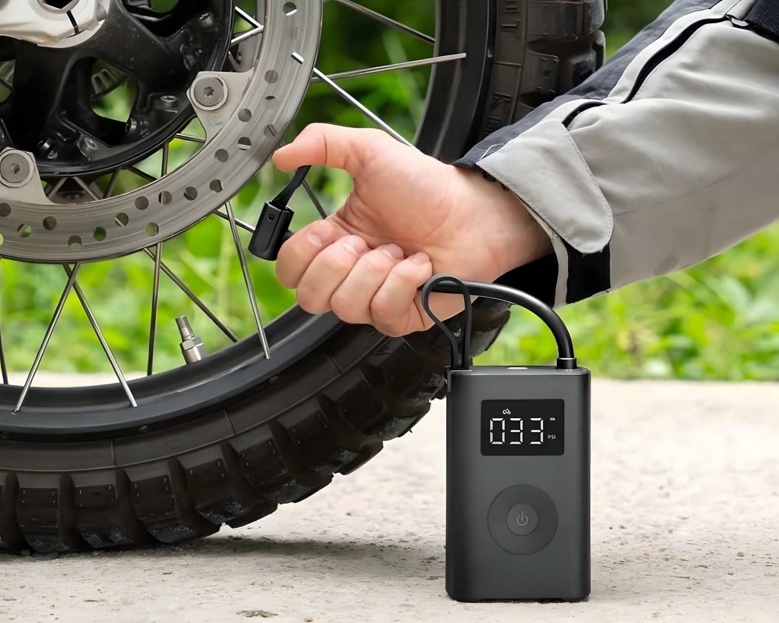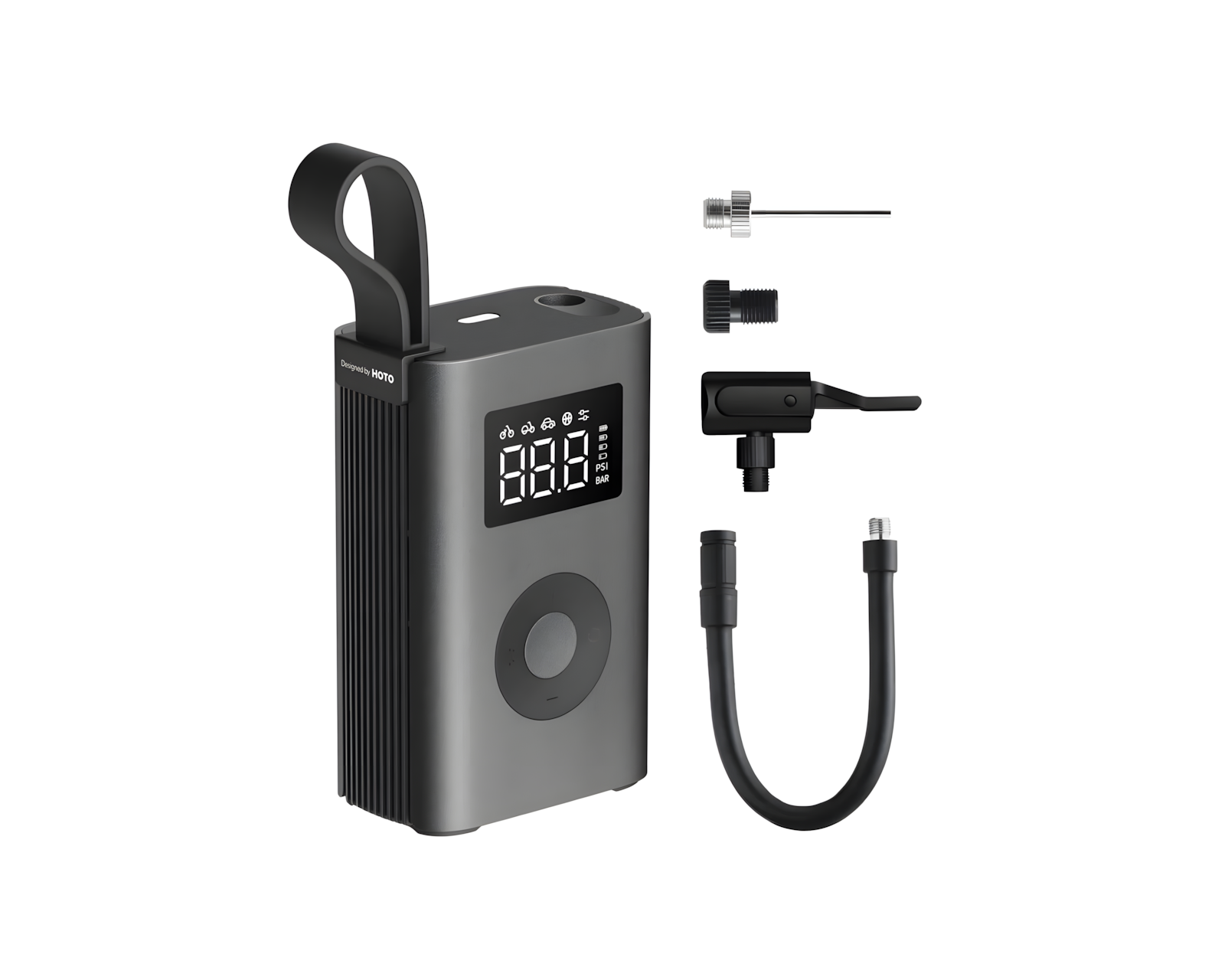 Elektrische Luftpumpe (ADV) ist ein kompakter elektrischer Luftkompressor von HOTO, der zum Aufpumpen von Reifen für Fahrräder, Motorräder und Autos entwickelt wurde. Sie verfügt über eine digitale Druckeinstellung, die von 3 bis 150 psi reicht, und schaltet sich automatisch bei dem eingestellten Druck ab. Die Pumpe merkt sich auch die letzte Einstellung für die nächste Verwendung.Diese Luftpumpe kann für Straßenfahrräder, E-Bikes, Motorradreifen, Autoreifen, Bälle und andere aufblasbare Objekte verwendet werden. Sie ist mit einem integrierten Lithium-Akku ausgestattet, der ausreichend Energie zum Pumpen mehrerer Fahrrad- und Autoreifen liefert und schnell über USB-C aufgeladen werden kann. Eine kleine Anzeige zeigt den Ladestatus an. Im Lieferumfang sind Schrader-, Presta-, Dunlop- und Nadelventiladapter sowie ein Hochdruckluftschlauch und eine Tragetasche enthalten.