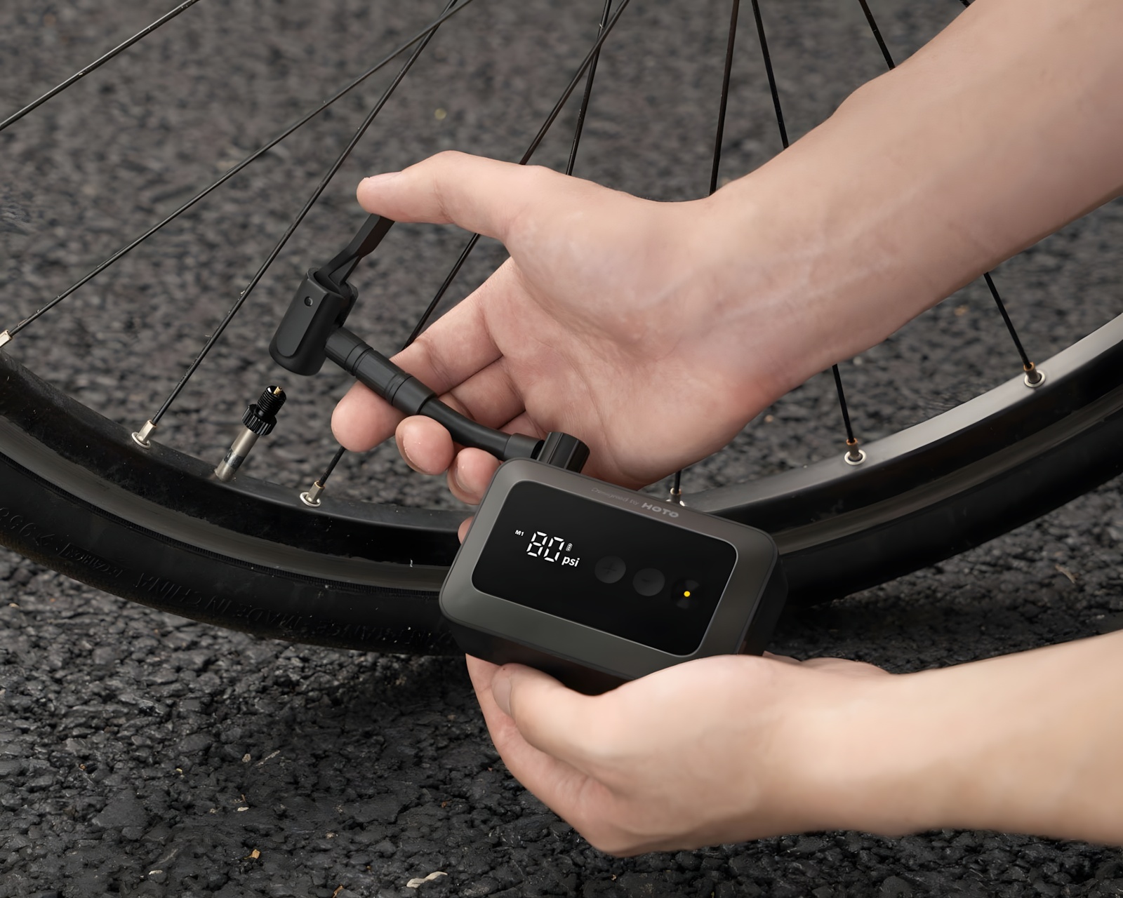 Luftpump Fickformat ist eine kompakte elektrische Luftpumpe von HOTO. Sie ist für die Verwendung mit Fahrrädern, Motorradreifen und Bällen konzipiert. Mit einer digital einstellbaren Druckeinstellung von 3 bis 150 psi schaltet sich die Pumpe automatisch ab, sobald der eingestellte Druck erreicht ist, und merkt sich die letzte Einstellung für eine schnelle Wiederverwendung. Sie eignet sich für Rennräder, E-Bikes, Motorradreifen sowie kleine aufblasbare Gegenstände.Die Konstruktion der Luftpumpe ist sowohl leicht als auch kompakt, was es einfach macht, sie in einer Tasche oder Tasche mitzunehmen. Der eingebaute Lithium-Akku liefert genügend Leistung, um bis zu acht Fahrradreifen aufzupumpen, und kann schnell über USB-C aufgeladen werden. Eine Anzeige zeigt den Ladezustand an, und die mitgelieferten Adapter unterstützen Schrader-, Presta- und Dunlop-Ventile sowie Schnellkupplungs- und Nadelventile. Mit diesen Komponenten ist die Pumpe vielseitig und kann für eine Vielzahl von aufblasbaren Objekten verwendet werden.
