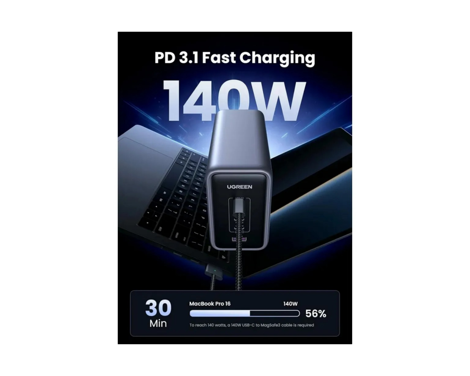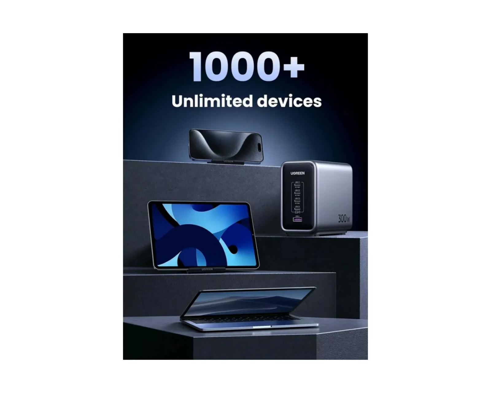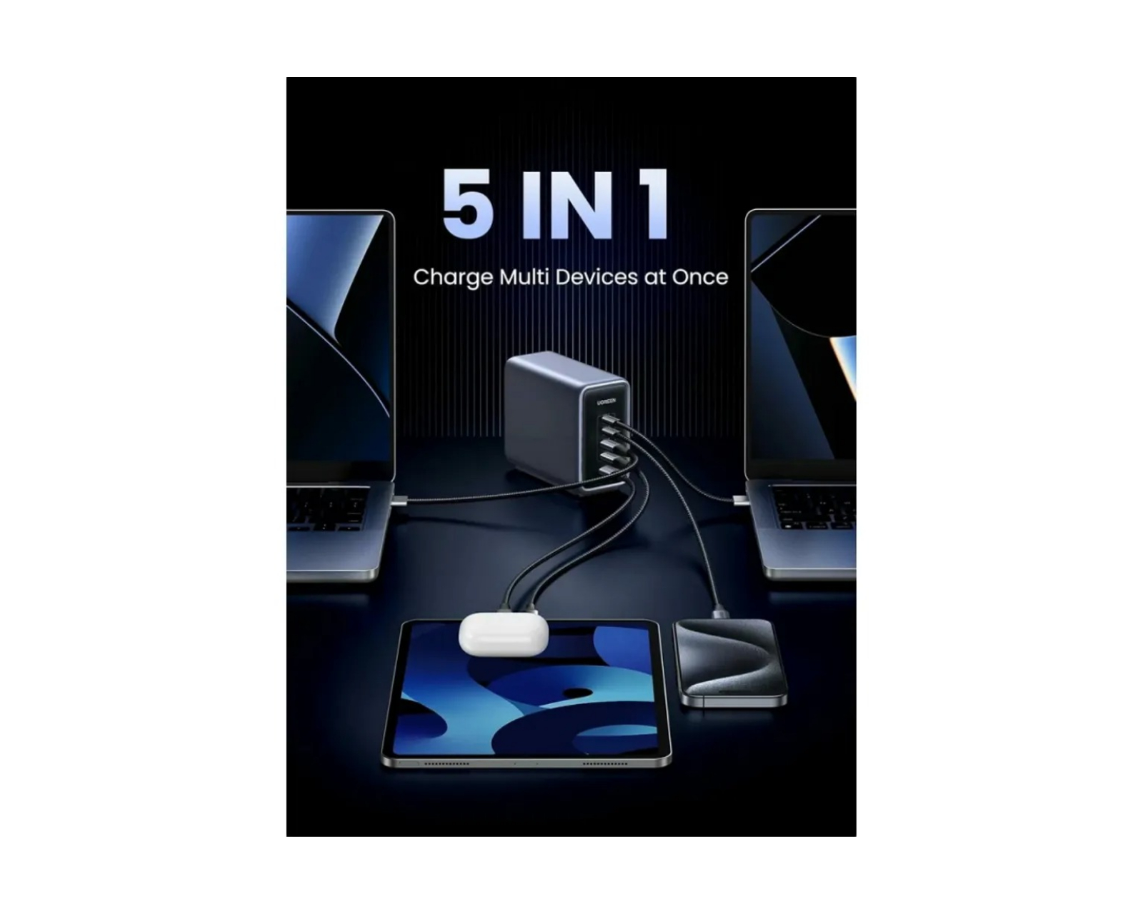 Wir stellen Ihnen das UGREEN Nexode 300W 5-Port PD GaN Desktop Charger vor, das leistungsstarke Ladegerät, das die Art und Weise, wie Sie Ihre Geräte aufladen, revolutionieren wird. Das Ladegerät ist für den modernen Laptop-Benutzer konzipiert und verfügt über eine beeindruckende Superleistung von 300 W, sodass Sie problemlos bis zu 5 Geräte gleichzeitig aufladen können. Verabschieden Sie sich von Kabelsalat und langsamen Ladezeiten - der UGREEN Nexode bietet Ihnen die Geschwindigkeit, Effizienz und den Komfort, nach denen Sie gesucht haben.Eines der herausragenden Merkmale dieses Ladegeräts ist seine Fähigkeit, nicht nur einen, nicht zwei, sondern drei Laptops gleichzeitig mit Strom zu versorgen. Mit dem USB-C1-Anschluss mit satten 140 W und den USB-C2- und C3-Anschlüssen mit 100 W bzw. 60 W können Sie Ihre Laptops blitzschnell aufladen. Egal, ob Sie ein vielbeschäftigter Berufstätiger sind, der an mehreren Geräten arbeitet, ein Student, der Aufgaben jongliert, oder eine kreative Person, die ressourcenintensive Software verwendet, UGREEN Nexode hat, was Sie brauchen.