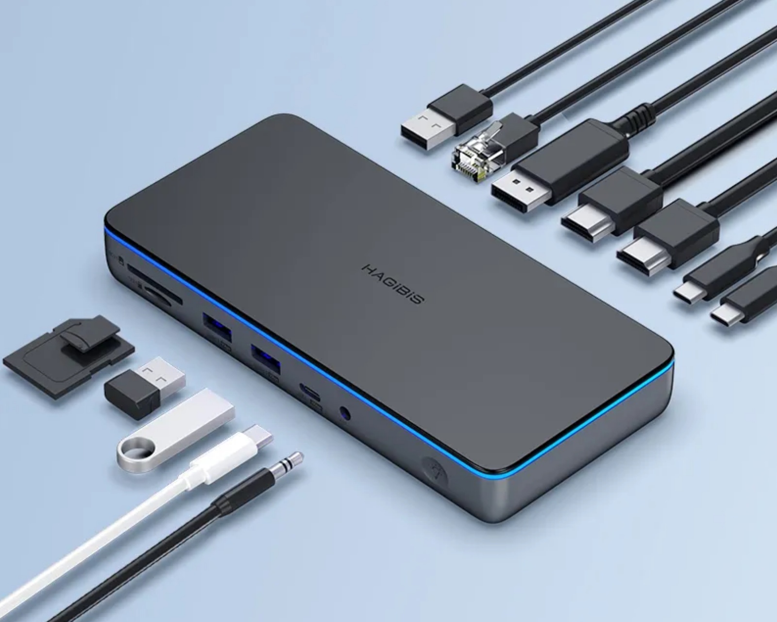 USB C Hub CD100 ist ein Adapter von Hagibis, der volle Funktionalität ohne Grenzen bietet. Er unterstützt die gleichzeitige Verbindung und Nutzung mehrerer Schnittstellen, was es ermöglicht, zu erweitern, sich mit Netzwerken zu verbinden, aufzuladen und Daten gleichzeitig zu übertragen. Das Produkt ist für Benutzer von Apple-Computern vorgesehen und kann drei Bildschirme anschließen, um unterschiedliche Inhalte anzuzeigen, einschließlich Unterstützung für Computer mit M1- und M2-Chip.Die Konstruktion des Hubs umfasst einen DisplayLink-Chip, der Einschränkungen bei der Multi-Bildschirmdarstellung aufhebt und einen reibungslosen Wechsel zwischen Spiegelmodus und erweitertem Modus ermöglicht. Der Hub unterstützt eine 8K-Auflösung bei 30Hz und 4K bei 60Hz für eine klare und detaillierte Bildqualität. Er verfügt auch über 100W Power Delivery mit Überspannungsschutz. Das bedeutet, dass der Hub angeschlossene Geräte schnell aufladen kann, auch wenn der tatsächliche Verbrauch immer ≤ 85W ist, da der Hub 15W für seine eigene Stromversorgung benötigt.