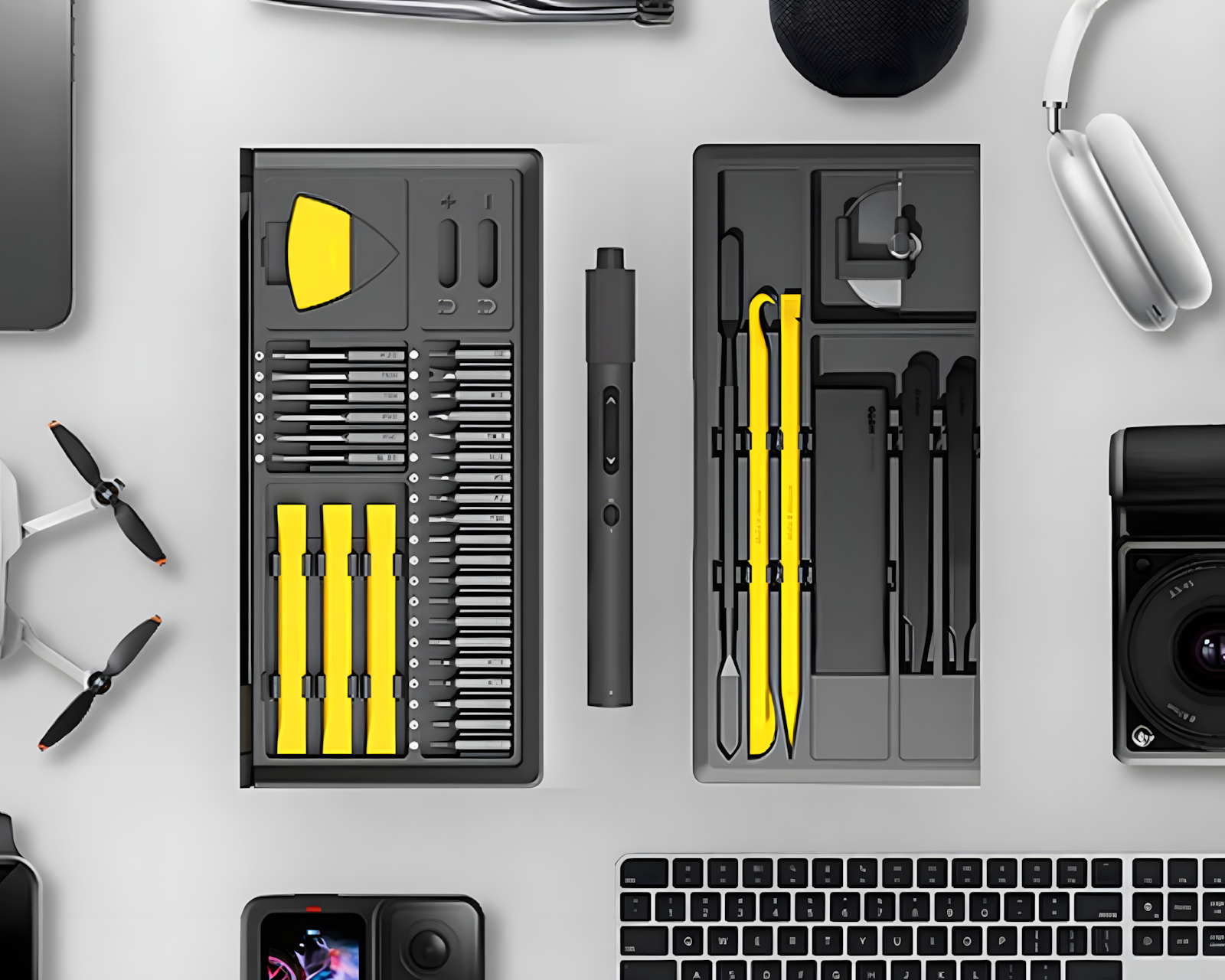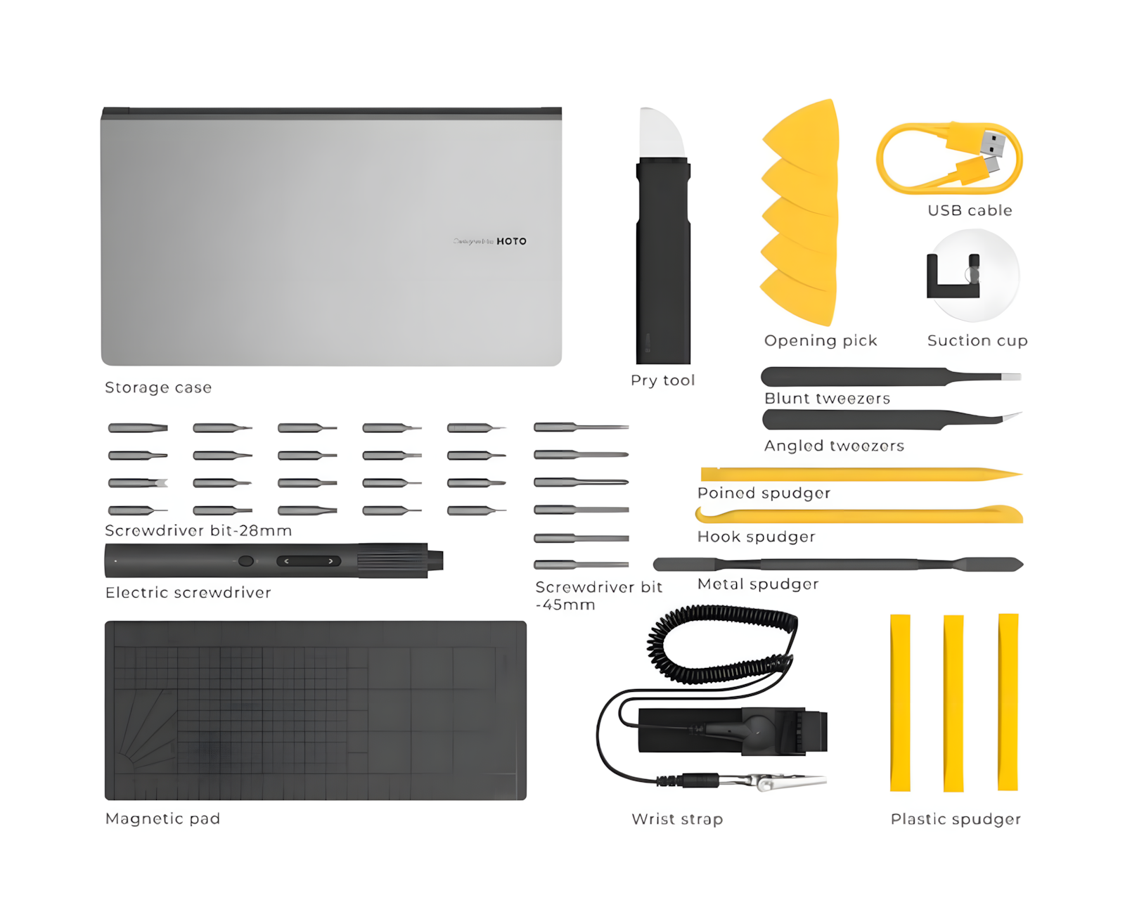 Precision Skruvmejselkit Pro ist ein elektrischer Schraubendreher von HOTO, der Präzision und praktische Funktionalität kombiniert. Er ist mit einer Dual-Torque-Funktion ausgestattet, die es einfach macht, zwischen empfindlichen und anspruchsvollen Aufgaben zu wechseln. Mit einer Knopfverriegelung für einfache Aktivierung und LED-Beleuchtung, um den Arbeitsbereich auszuleuchten, bietet dieses Set Benutzerfreundlichkeit und Effizienz. Es verfügt auch über einen schnellen magnetischen Bitwechsel für eine reibungslose Handhabung.Das Set besteht aus 48 hochwertigen Zubehörteilen, die ein breites Anwendungsspektrum ermöglichen, von kleinen elektronischen Geräten bis hin zu Heimreparaturen. Das gesamte Set wird in einer Klamshell-Arbeitsstation aufbewahrt, die alles organisiert und leicht zugänglich hält. Die Bauqualität ist hoch mit starken Materialwahl, die Haltbarkeit gewährleistet. Der elektrische Schraubendreher zeigt zuverlässige Leistung, was ihn sowohl für Profis als auch für Selbstversorger geeignet macht, die Effizienz und Genauigkeit schätzen.