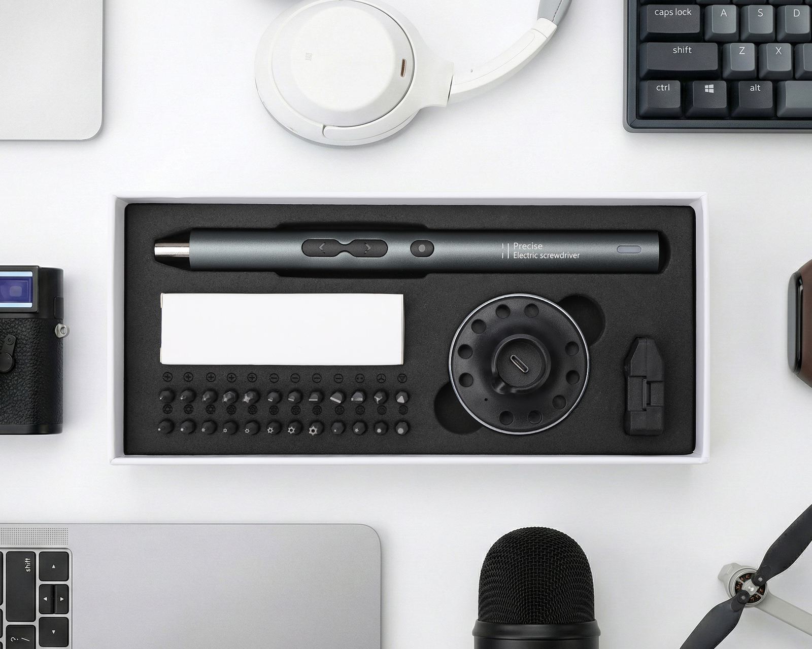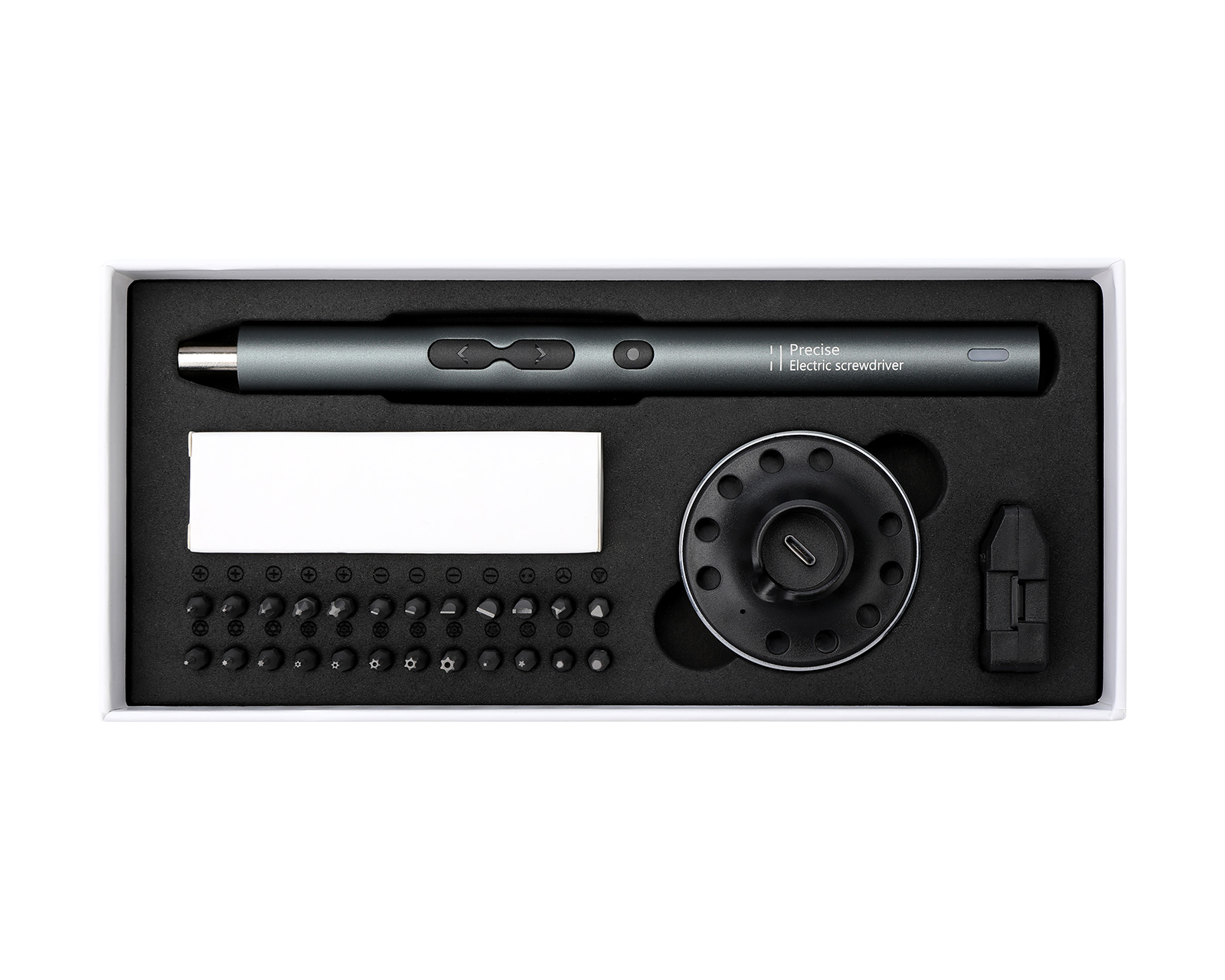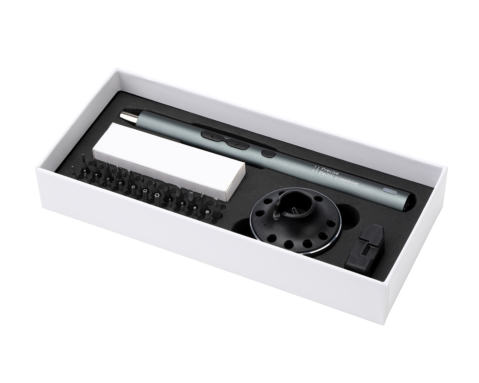 Elektro-Präzisionsschraubendreher von MaxMount, entwickelt um die Bedürfnisse technikbegeisterter Nutzer zu erfüllen. Dieser kompakte Schraubendreher bietet 24 Premium S2 Stahl-Schraubbits und eine praktische Ladestation für eine einfache Verwendung. Entworfen um optimale Präzision und Haltbarkeit zu gewährleisten, mit einem ergonomischen Gehäuse, das das Schrauben einfach und bequem macht.Der Schraubendreher verfügt über einen leistungsstarken 350mAh Lithium-Akku, der eine vollständige Aufladung in 50 Minuten bietet und bis zu 300 Schrauben pro Ladung schrauben kann. Die schattenfreie 360-Grad-Beleuchtung mit drei eingebauten LED-Lampen beleuchtet den Arbeitsbereich effektiv. Darüber hinaus macht das kabellose und wiederaufladbare Design die Anwendung flexibel und bequem. Ein intelligenter Motor mit intelligenten Schutzfunktionen garantiert eine lange Lebensdauer und effizienten Betrieb. Mit einer maximalen Geschwindigkeit von 200 U/min und einem maximalen elektrischen Drehmoment von 0,35N.m ist dieser Schraubendreher perfekt für eine Vielzahl von Anwendungen zu Hause oder im Büro.