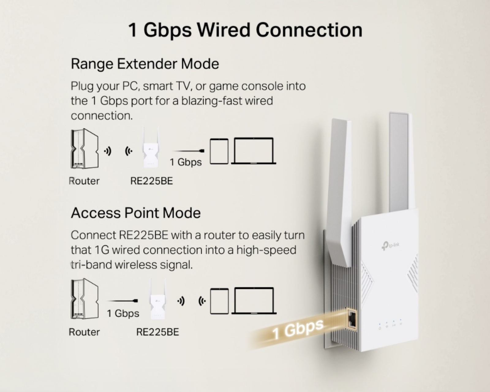 RE225BE BE3600 Dual-Band Wi-Fi 7 Reichweitenverlängerer ist eine hochleistungsfähige Netzwerk-Lösung von TP-Link, die entwickelt wurde, um Ihr Wi-Fi-Netzwerk zu erweitern. Mit Geschwindigkeiten von bis zu 3,6 Gbps (2882 Mbps bei 5 GHz und 688 Mbps bei 2,4 GHz) wird eine stabile und schnelle Internet-Erfahrung für Streaming, Gaming und Multitasking in Ihrem Wohn- oder Arbeitsumfeld sichergestellt.Dieser Reichweitenverlängerer unterstützt Multi-Link Operation (MLO), das den Durchsatz verbessert und die Latenz reduziert, indem es mehrere Verbindungen gleichzeitig nutzt. Ausgestattet mit einem Gigabit Ethernet-Port ermöglicht er schnelle kabelgebundene Verbindungen zu Geräten wie Smart-TVs, Computern und Spielkonsolen. Darüber hinaus bietet er die Smart Roaming-Funktion, die es Ihnen ermöglicht, sich frei zwischen Räumen zu bewegen, ohne die Verbindung zu verlieren. Er ist auch kompatibel mit der EasyMesh-Technologie, um ein nahtloses Mesh-Wi-Fi-System im gesamten Haus zu schaffen, was Signalprobleme eliminiert.